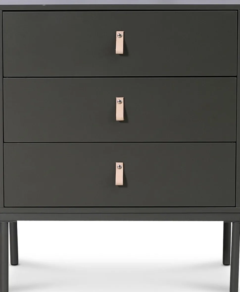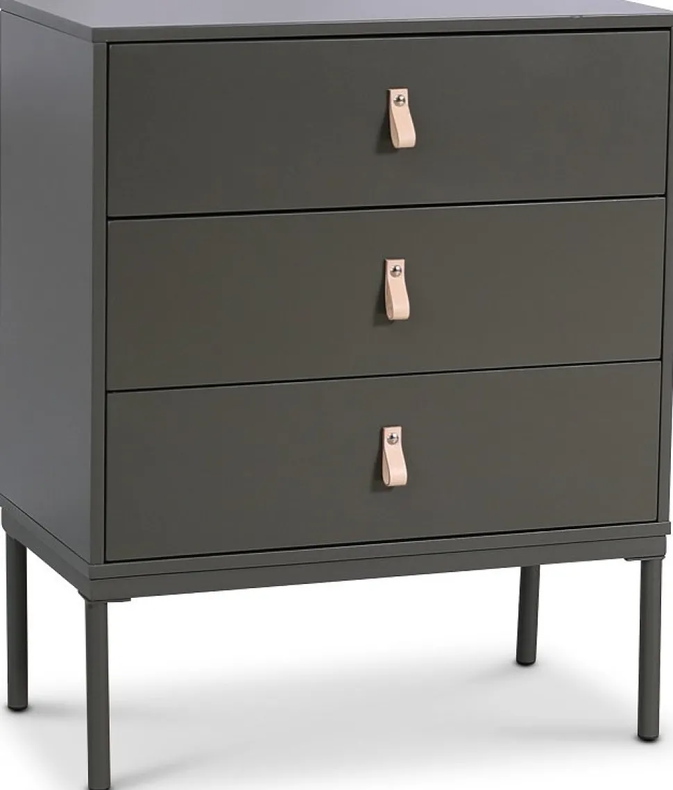 Fräck i grålackad MDF. Byrån har 3 rymliga lådor. Handtagen till lådorna är i skinn. Underrede i svartlackad metall för att ge en bra stabilitet.