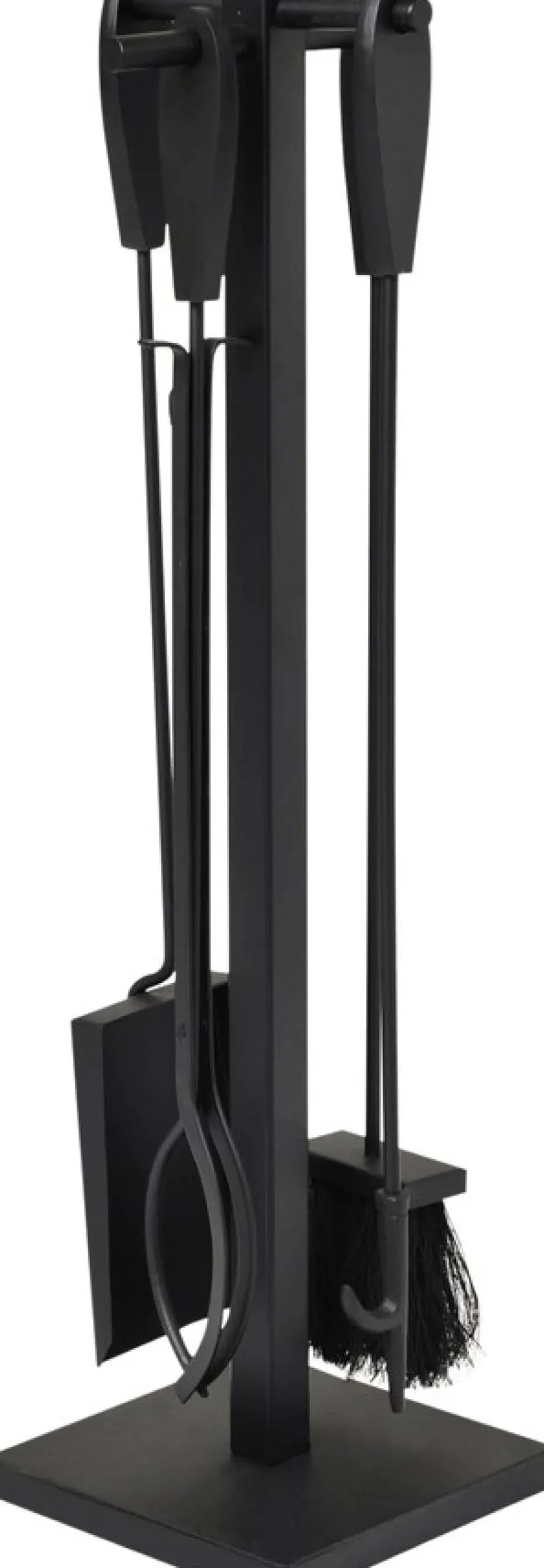 Eldställ i svartlackad metall med askborste, spistång, spiskrok och askspade