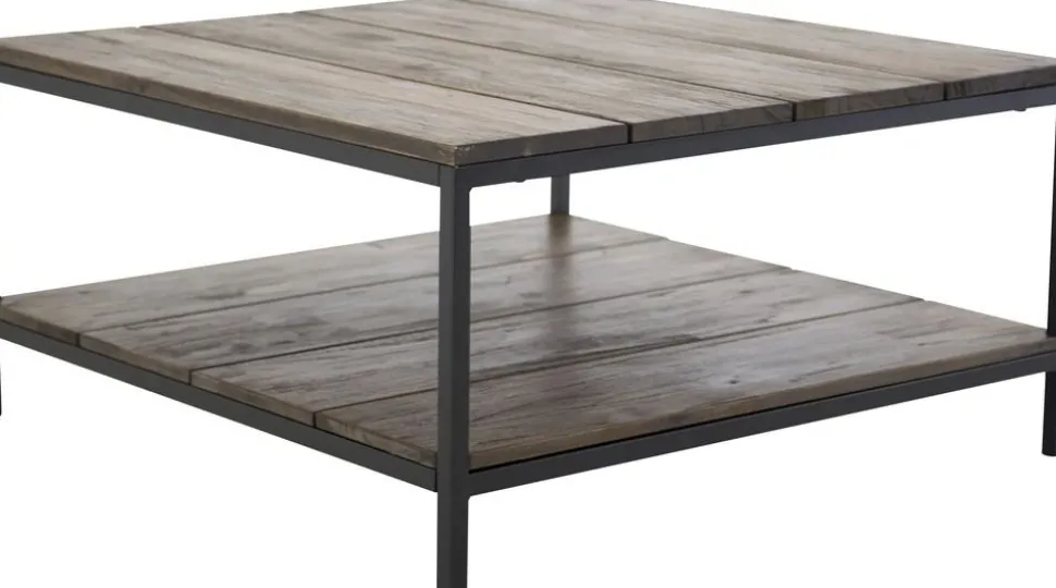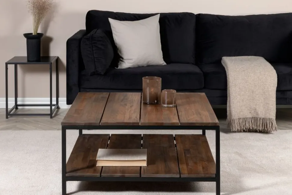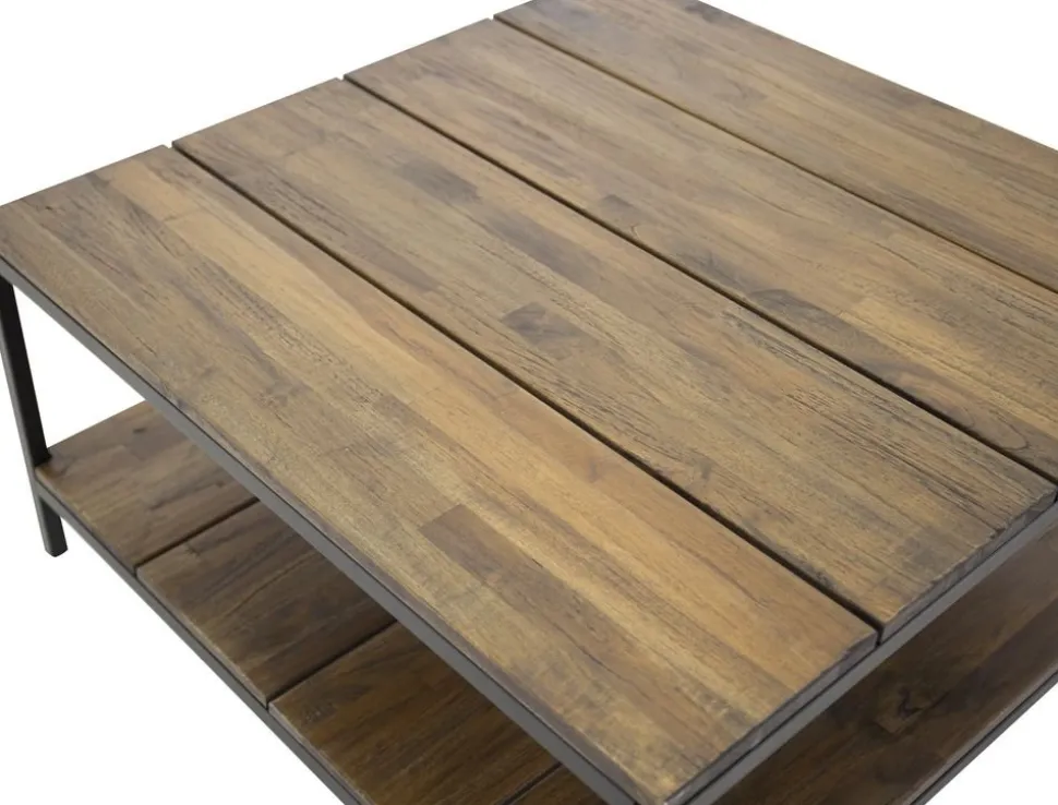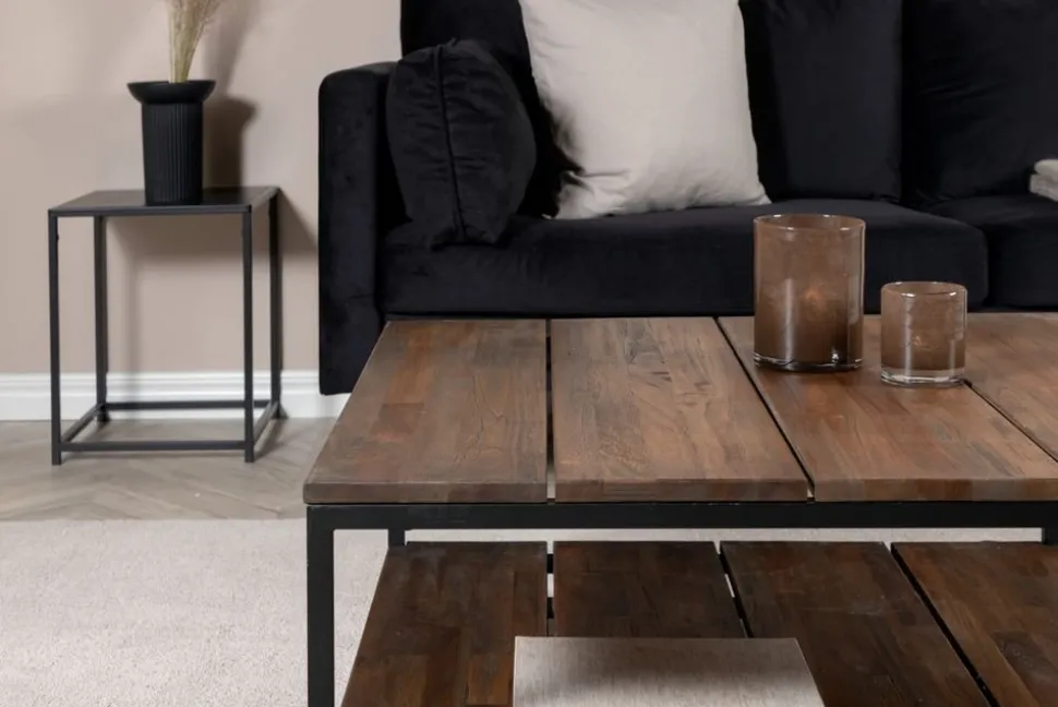 Soffbord i en vintage-look med sin toppskiva av limmad teak i vintage brunt utförande. Stomme av svart metall.