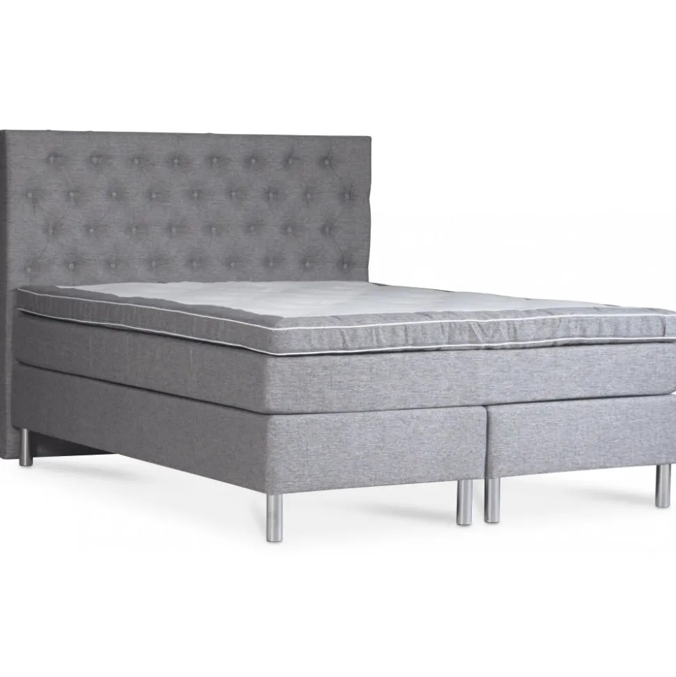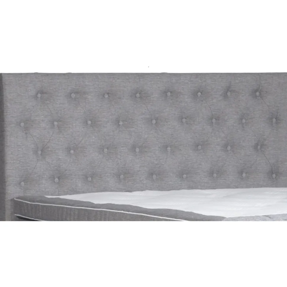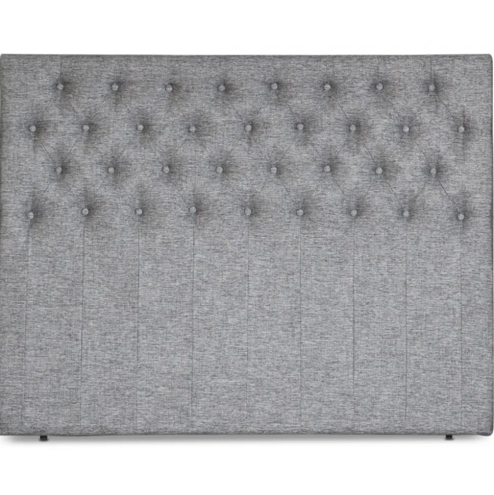 Sänggavel Hilton i grått slitstarkt tyg (Neve 85). Sänggaveln har en klassisk design med knappar för att ge sänggaveln ett så modernt utseende som möjligt i sovrummet.