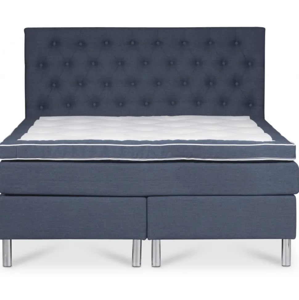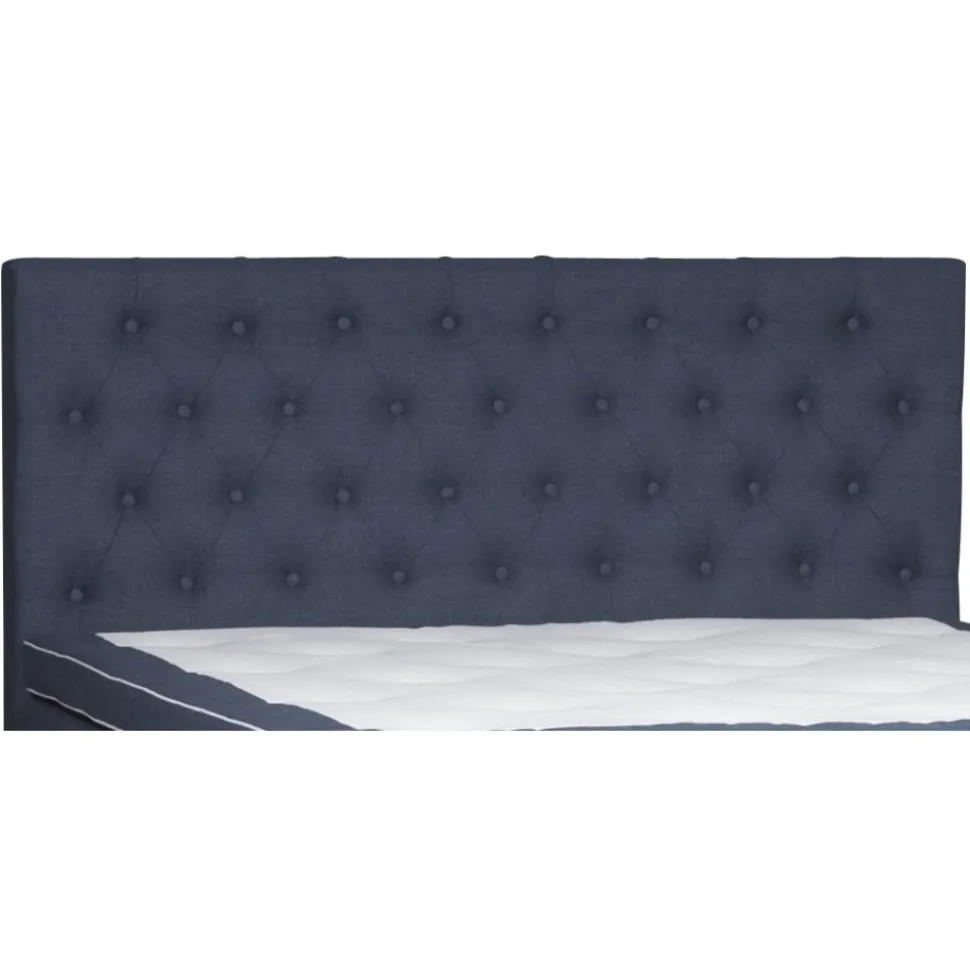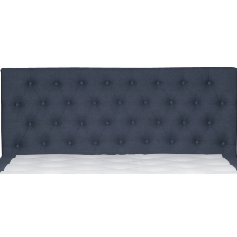 Sänggavel Hilton i Navyblue slitstarkt tyg (Inari 80). Sänggaveln har en klassisk design med djuphäftande knappar för att ge sänggaveln ett så modernt utseende som möjligt i sovrummet.