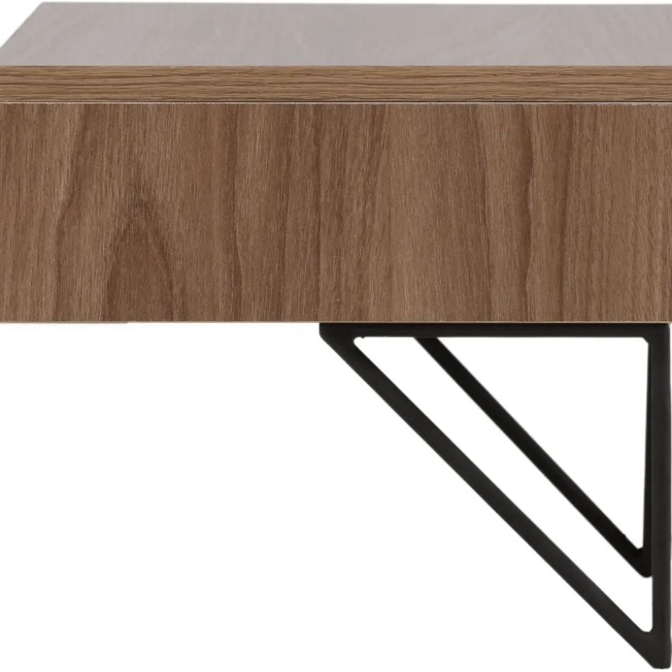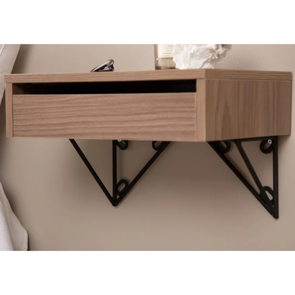 Ett charmigt som passar perfekt att hänga på väggen bredvid sängen, soffan eller varför inte i hallen? Det här smakfulla sidobordet i valnötfärgad MDF har en svart stålställning och en låda för dold förvaring. Den jordnära kulören och dekorativa upphängningen ger dig ett iögonfallande sidobord.