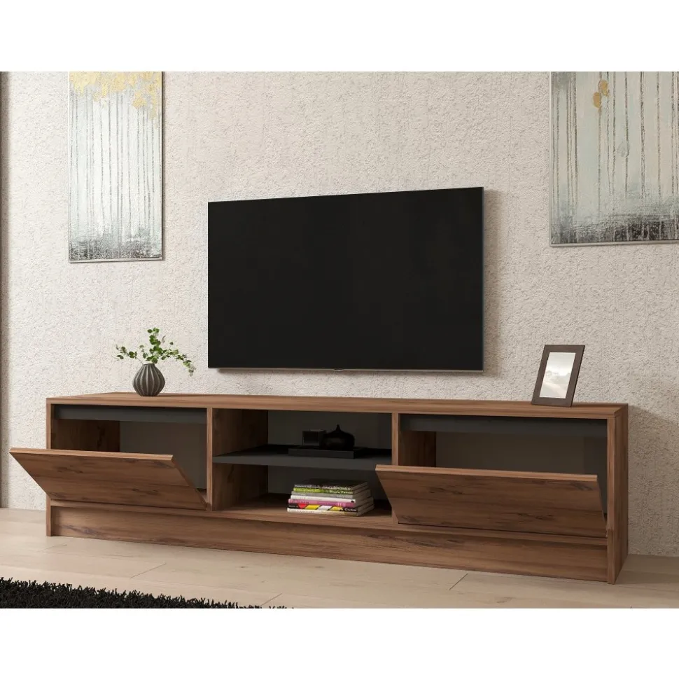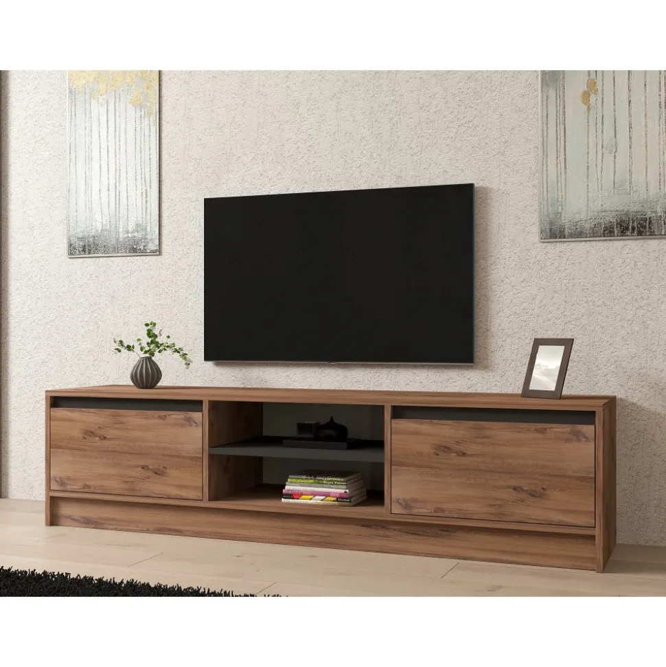 Mediabänk av melaminbelagd spånskiva med ben av plast.