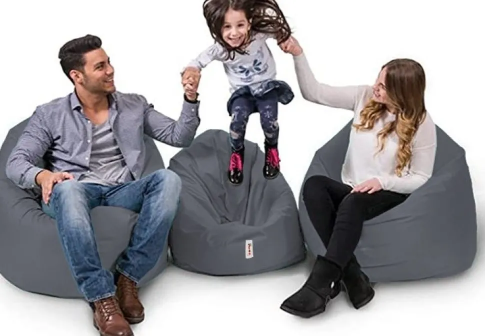 Sittsäck med klädsel av polyester och stoppning av frigolit.