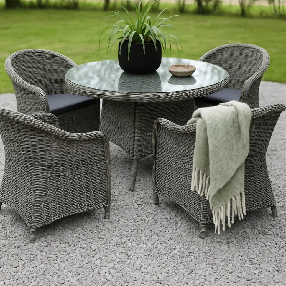 Matgrupp innehållande 1 st runt matbord i grå konstrotting med härdat glas som toppskiva, inklusive 4 st Mercury fåtöljer i matchande grå konstrotting med sittdyna och ryggdyna för bästa komfort. Matgruppen passar perfekt på altanen, uteplatsen och i uterummet.