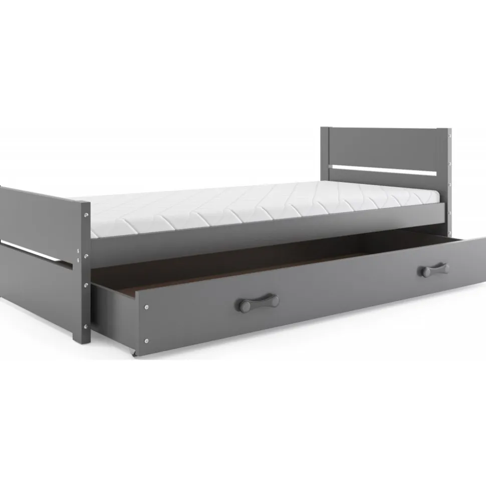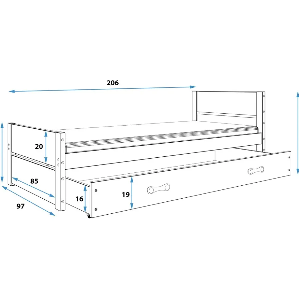 Sängen är byggd på en stabil stomme av massiv furu med ribbor av björkträ som vilar på metallskenor. Sidor och paneler är tillverkade av MDF, medan den utdragbara lådan är gjord av laminerad spånskiva med handtag i slitstark PVC-plast.