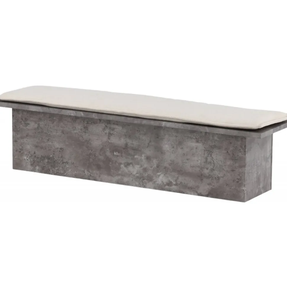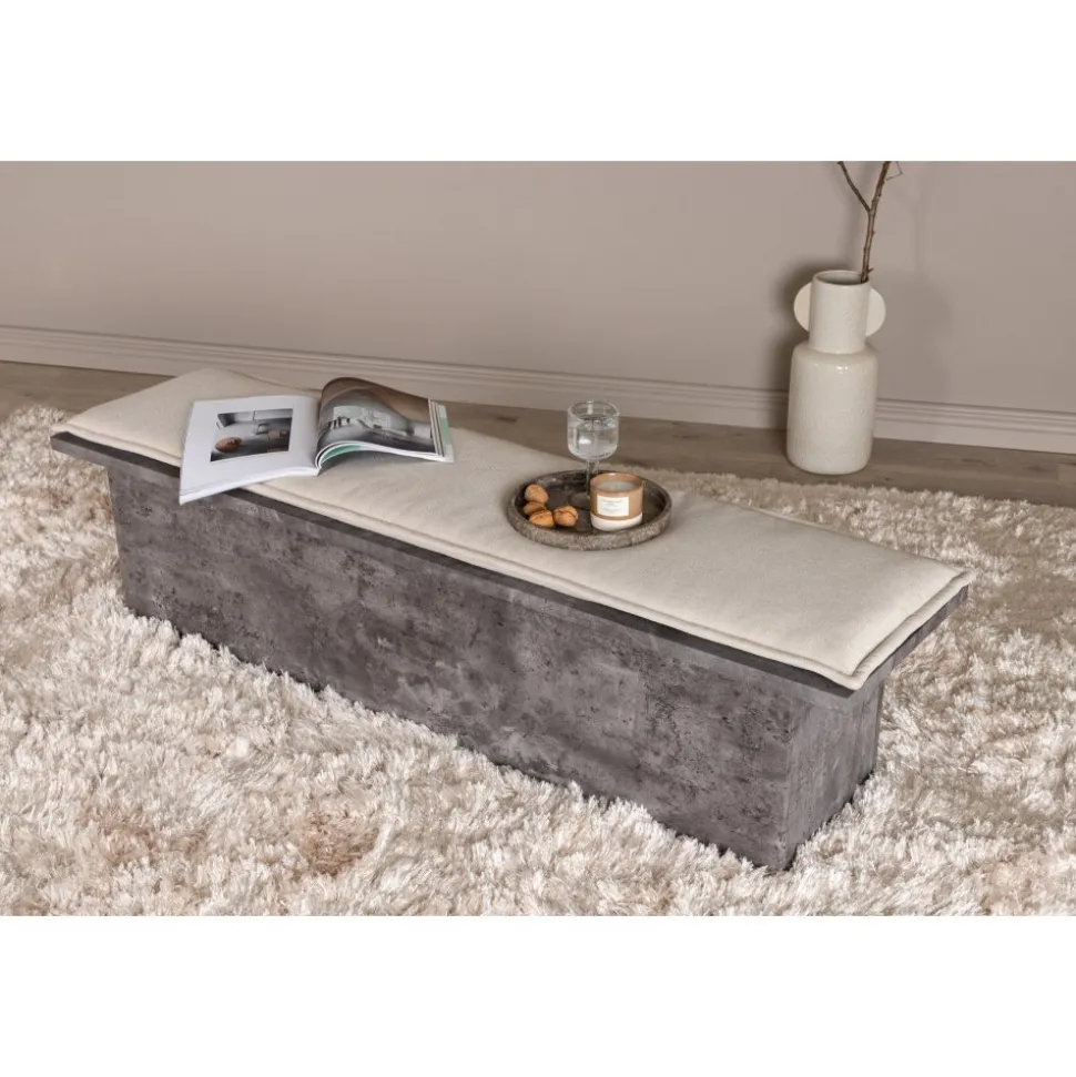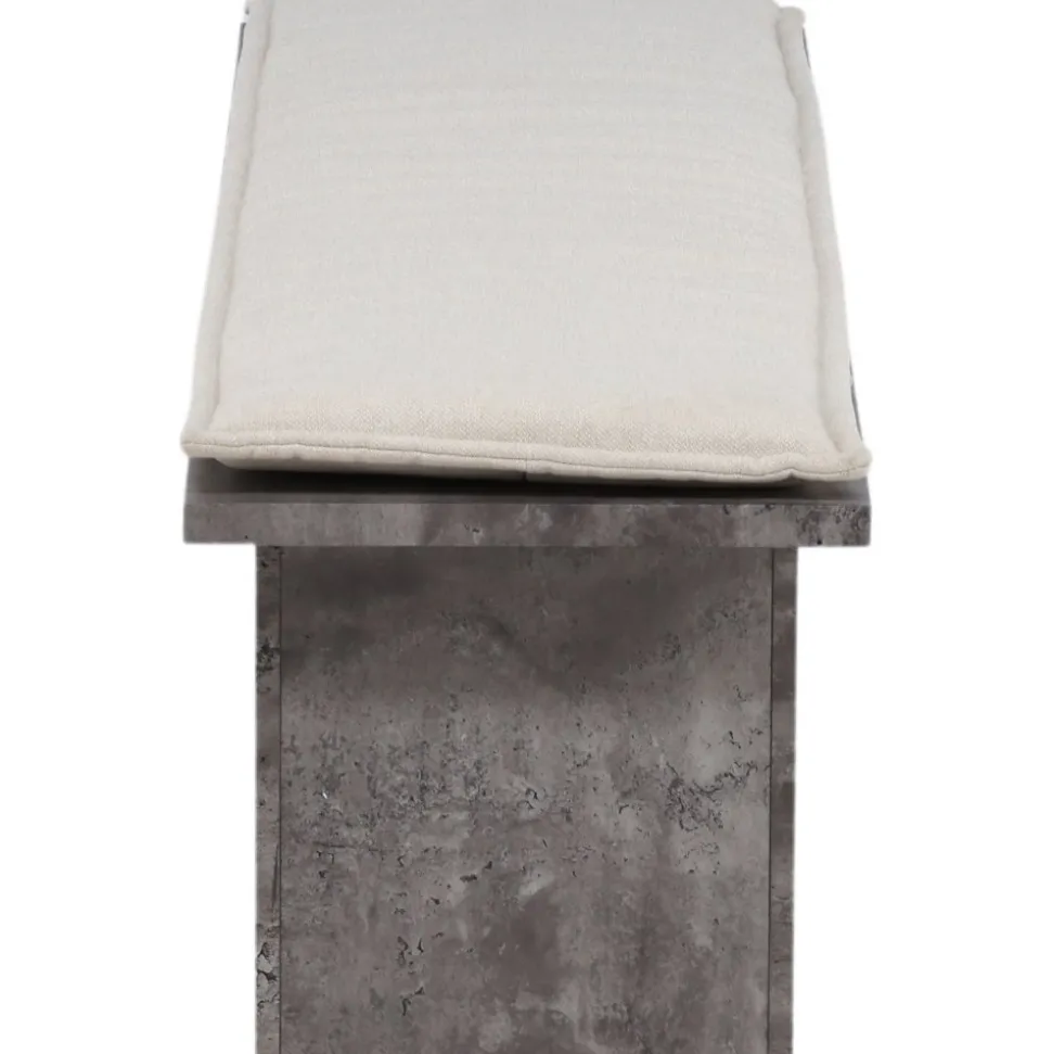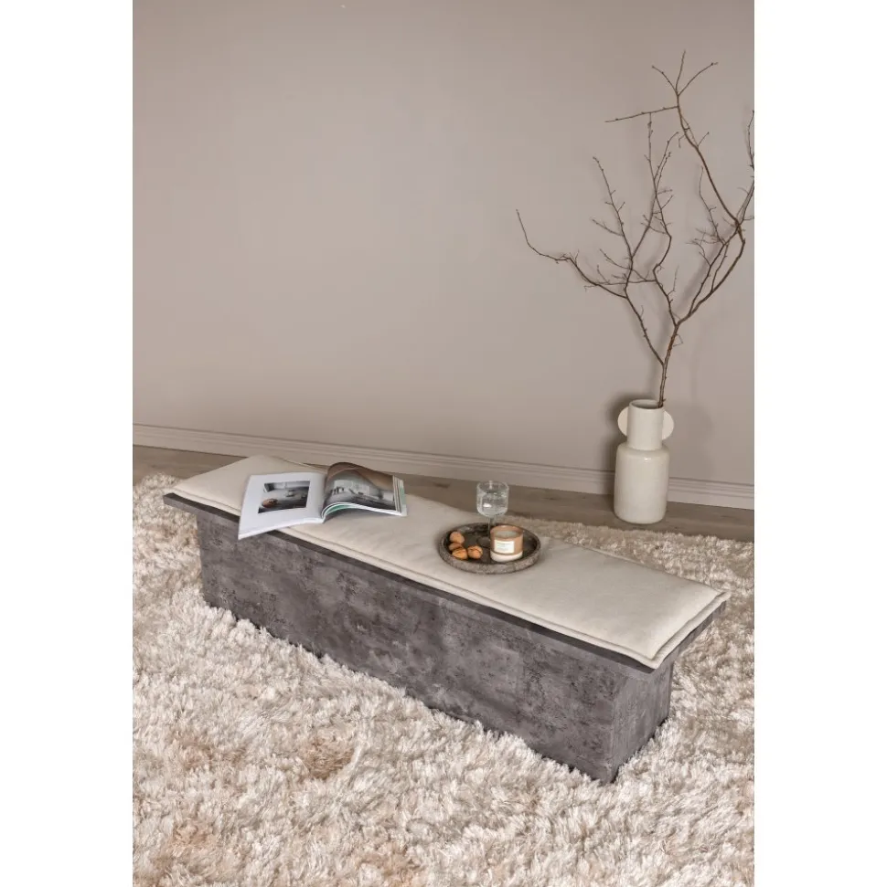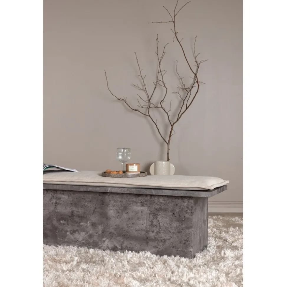 Bänk med rektangulär sits som har beige dyna och integrerat underrede format likt ett rätblock i industriell design. Tillverkad i grå sten-look som ger ett spräckligt liv åt möbeln. Den här bänken är en perfekt inredningsdetalj till hallen eller vardagsrummet, som solitär stilikon eller för att skapa fler sittplatser i hemmet.