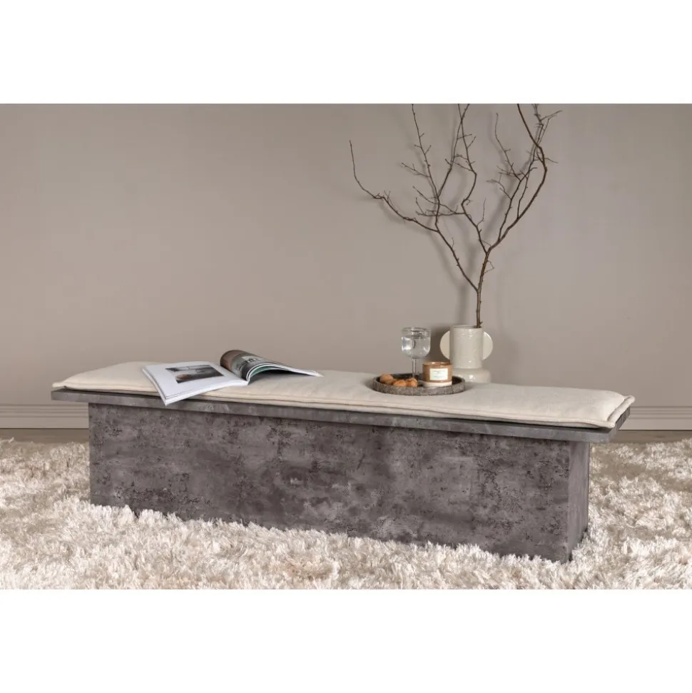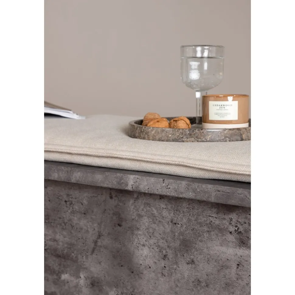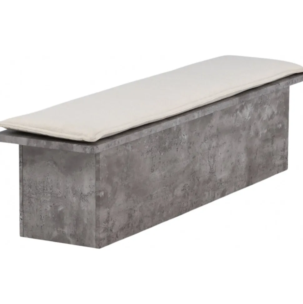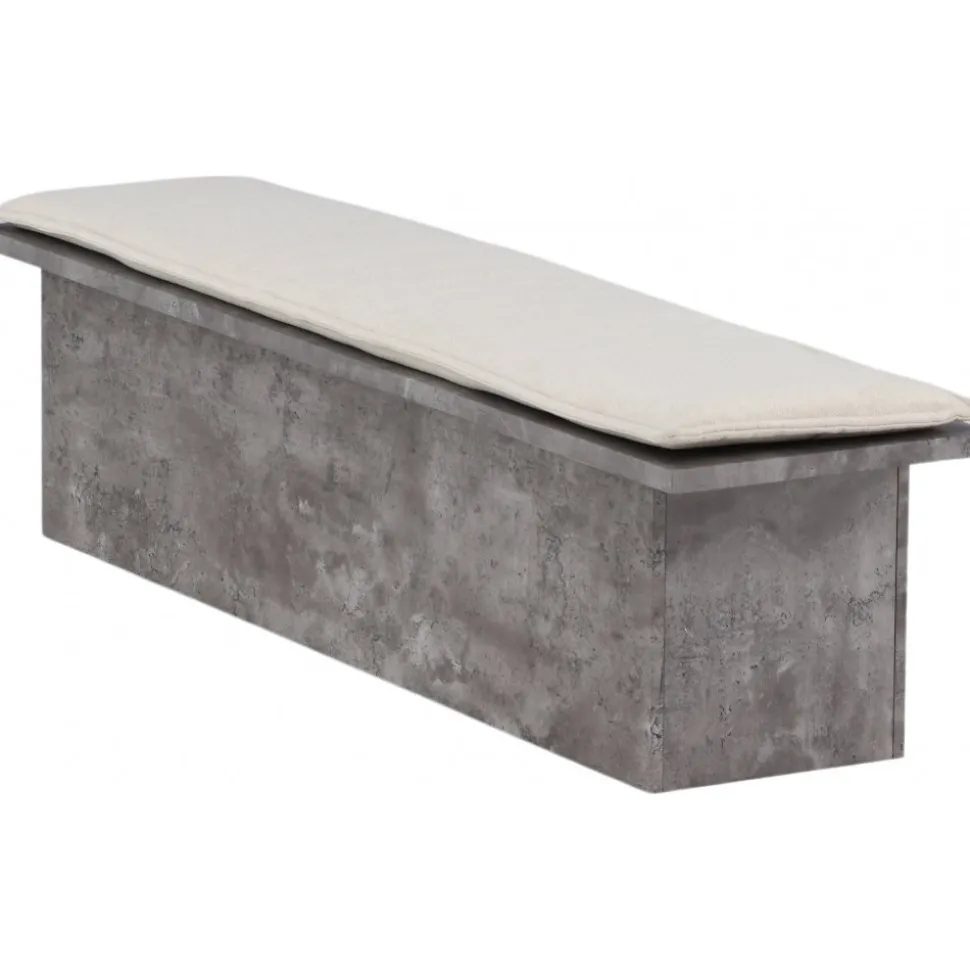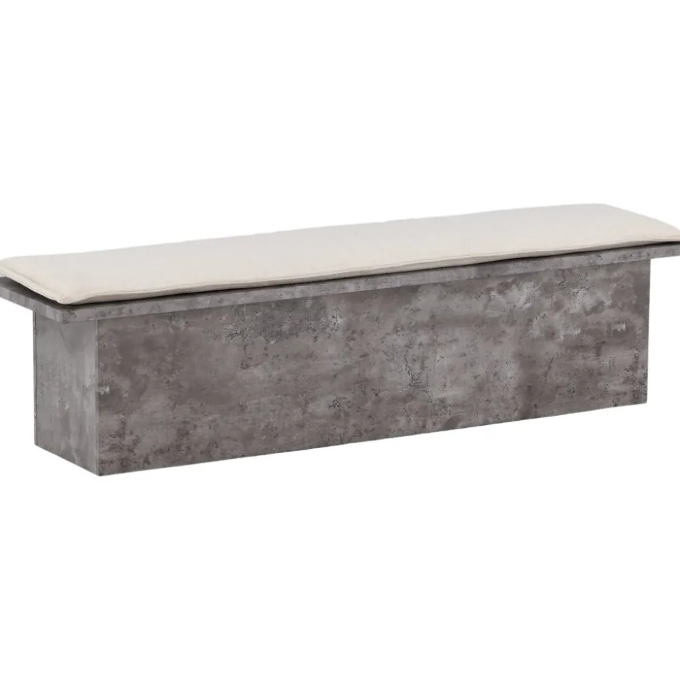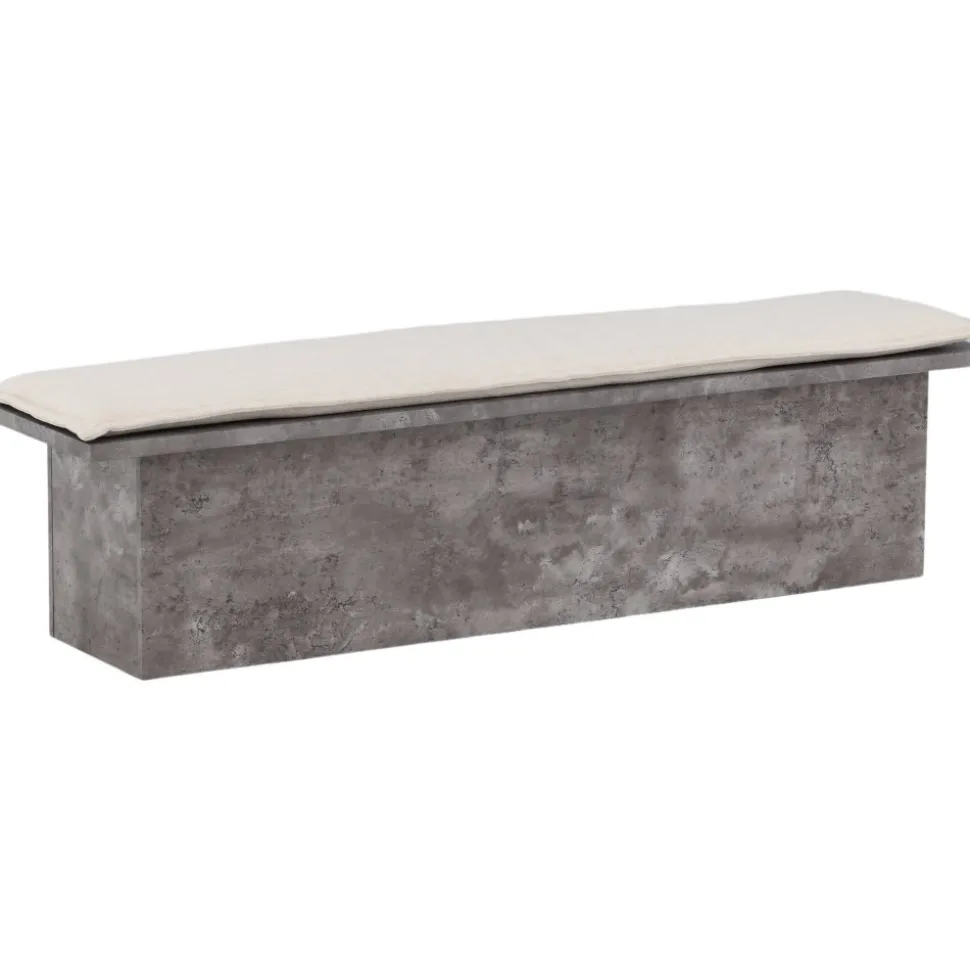 Bänk med rektangulär sits som har beige dyna och integrerat underrede format likt ett rätblock i industriell design. Tillverkad i grå sten-look som ger ett spräckligt liv åt möbeln. Den här bänken är en perfekt inredningsdetalj till hallen eller vardagsrummet, som solitär stilikon eller för att skapa fler sittplatser i hemmet.