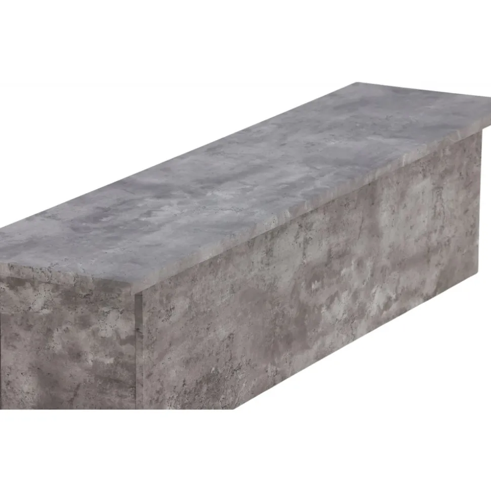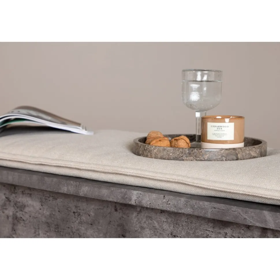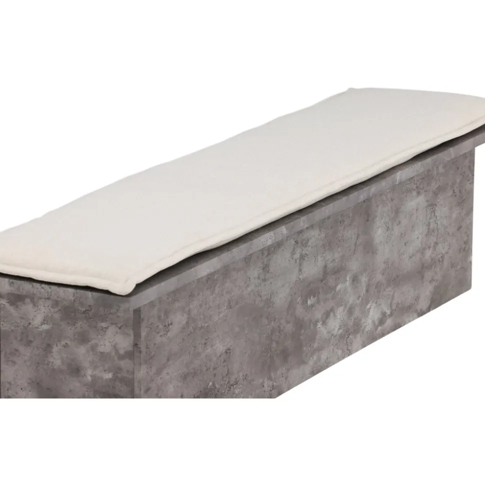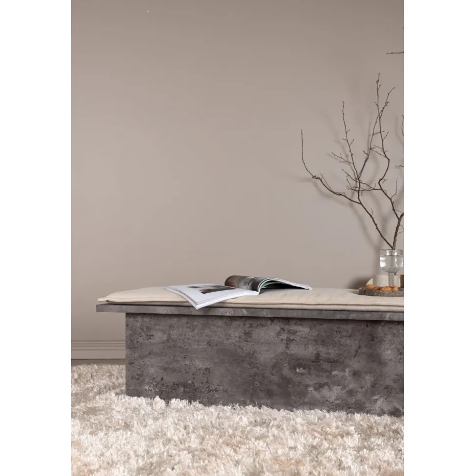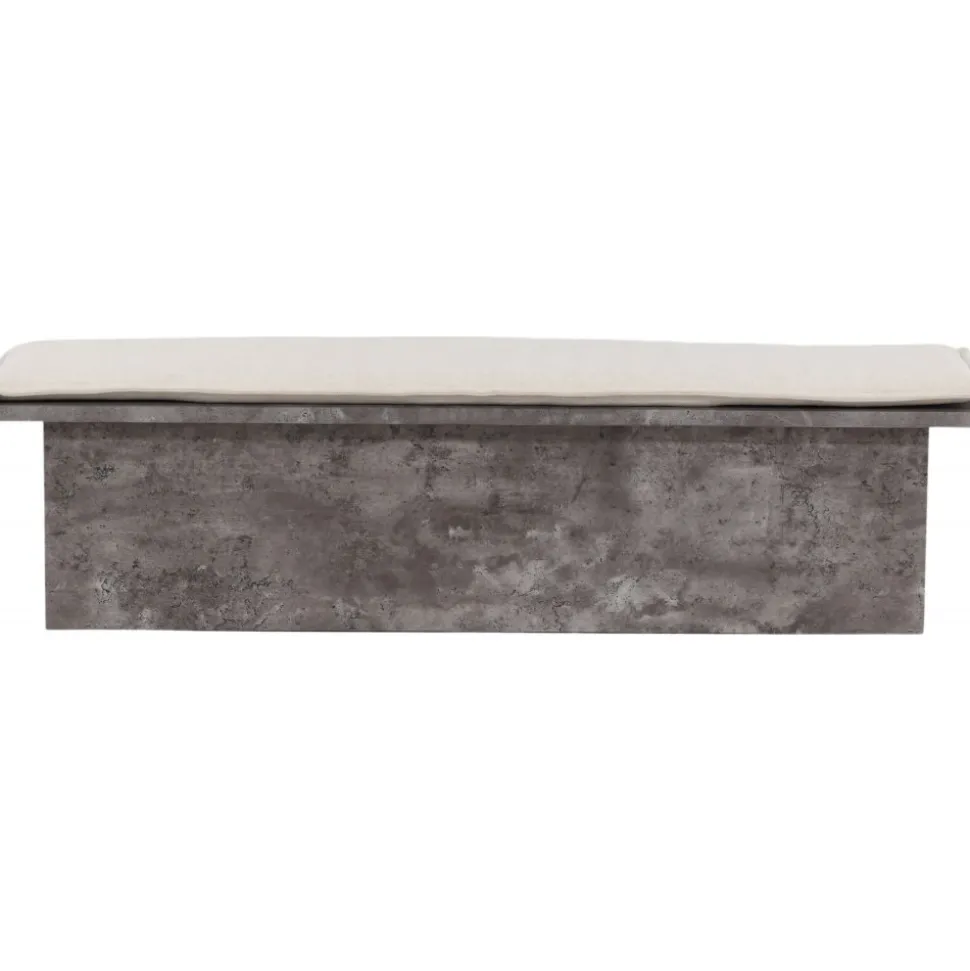 Bänk med rektangulär sits som har beige dyna och integrerat underrede format likt ett rätblock i industriell design. Tillverkad i grå sten-look som ger ett spräckligt liv åt möbeln. Den här bänken är en perfekt inredningsdetalj till hallen eller vardagsrummet, som solitär stilikon eller för att skapa fler sittplatser i hemmet.