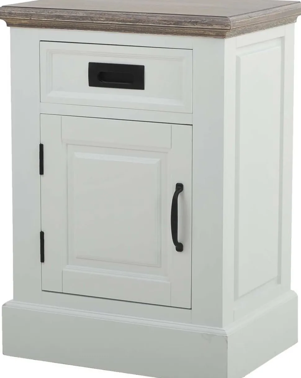 Knight sängbord kombinerar modern design med klassisk charm. Det stilrena sängbordet i vitt och grått har en låda och en dörr som ger praktiskt förvaringsutrymme, medan de svarta handtagen skapar en elegant kontrast till det ljusa utförandet.