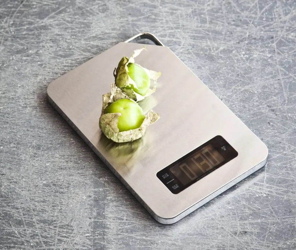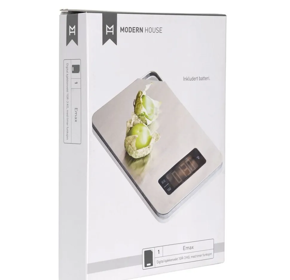 Köksvåg i 18/0-stål och ABS-plast med LCD-display. Vågen kan ange vikter mellan 1 – 3000 gram, finns även funktion för att vissa ounches. Köksvågen har timerfunktion. Vågen kan med fördel användas för att väga flera ingredienser i samma skål efter varandra, då nollställer du bara vikten innan du fyller på med mer ingredienser.