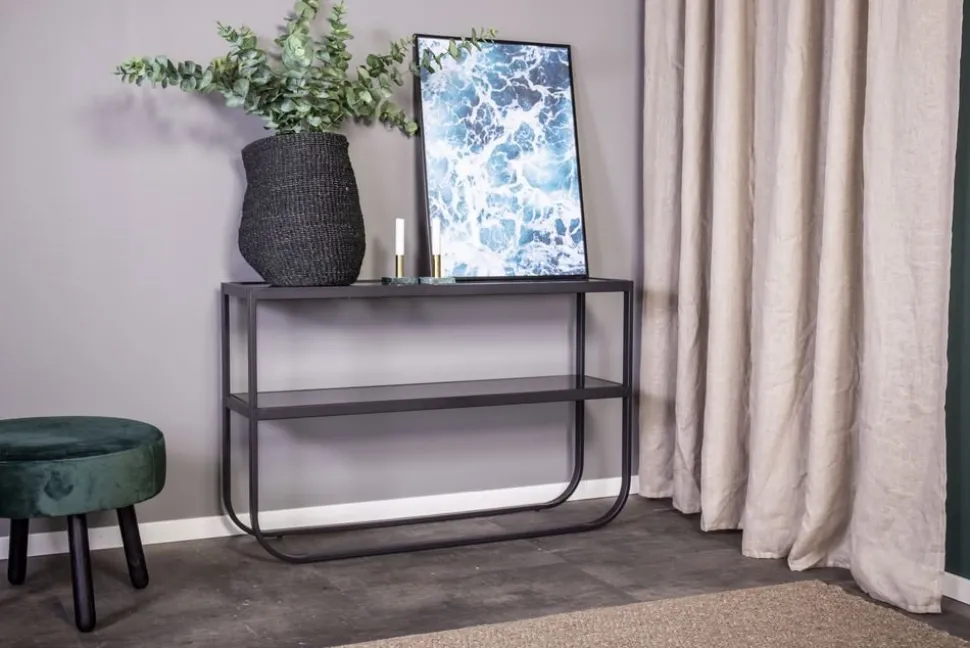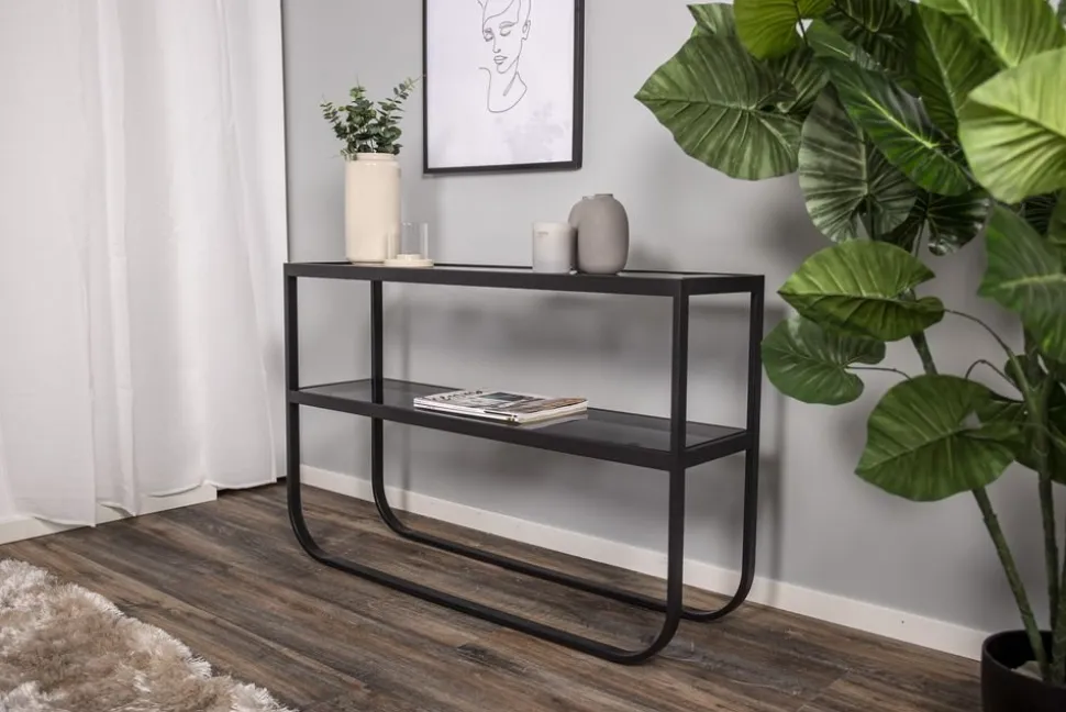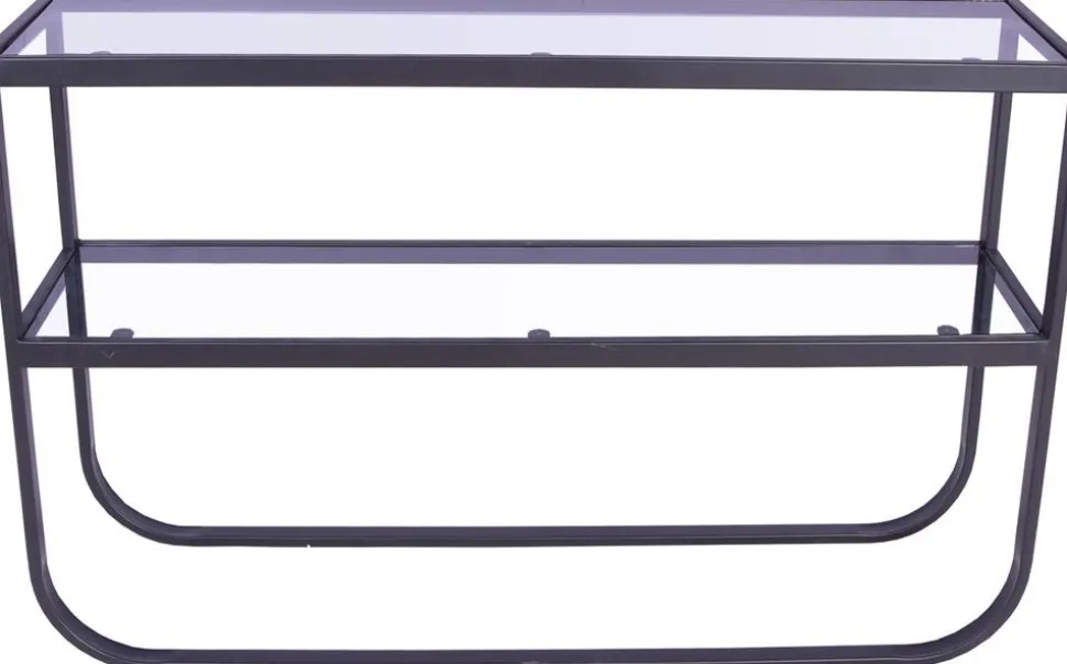 Korsbacken är en serie möbler med metallstomme och toppskivor/hyllplan av färgat glas. Denna variant har en svart stomme.