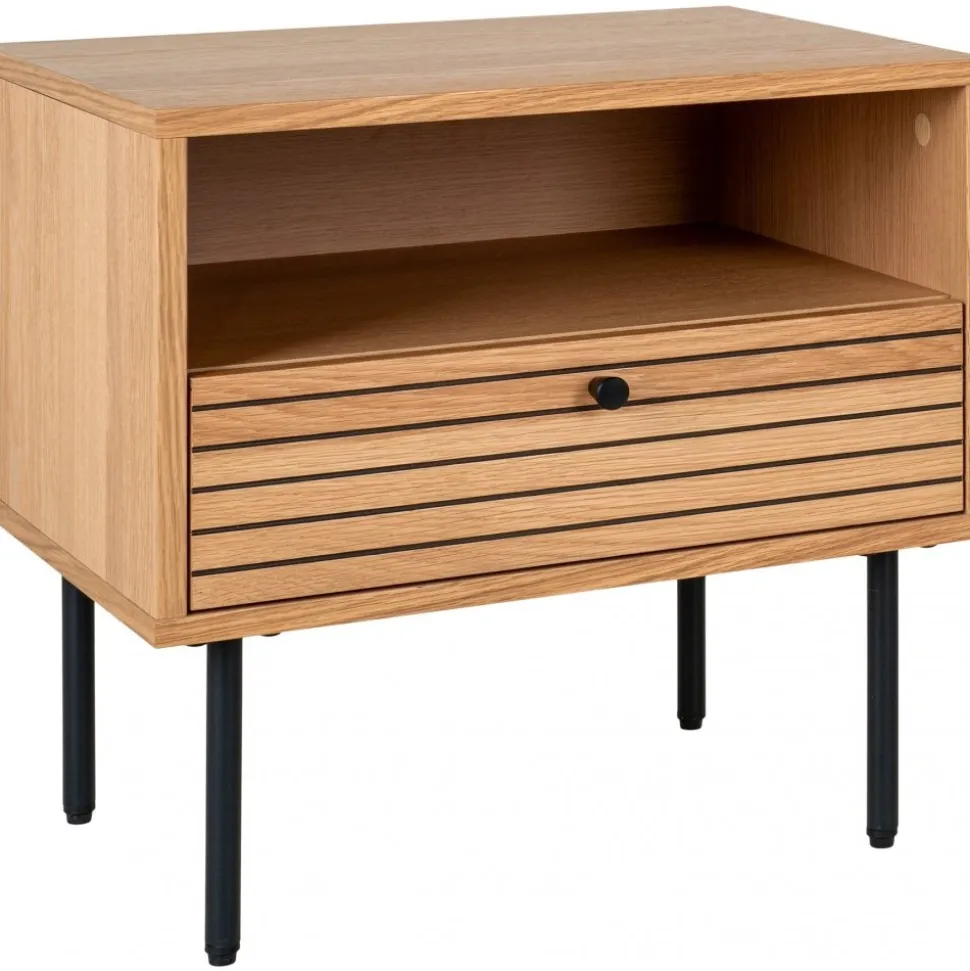 Sidobord av MDF, ekfáner och stål. Levereras omonterad.