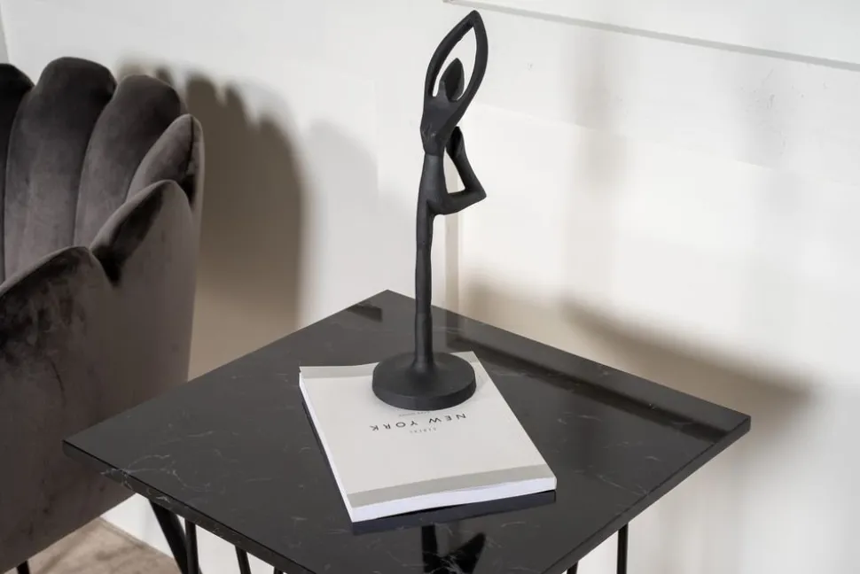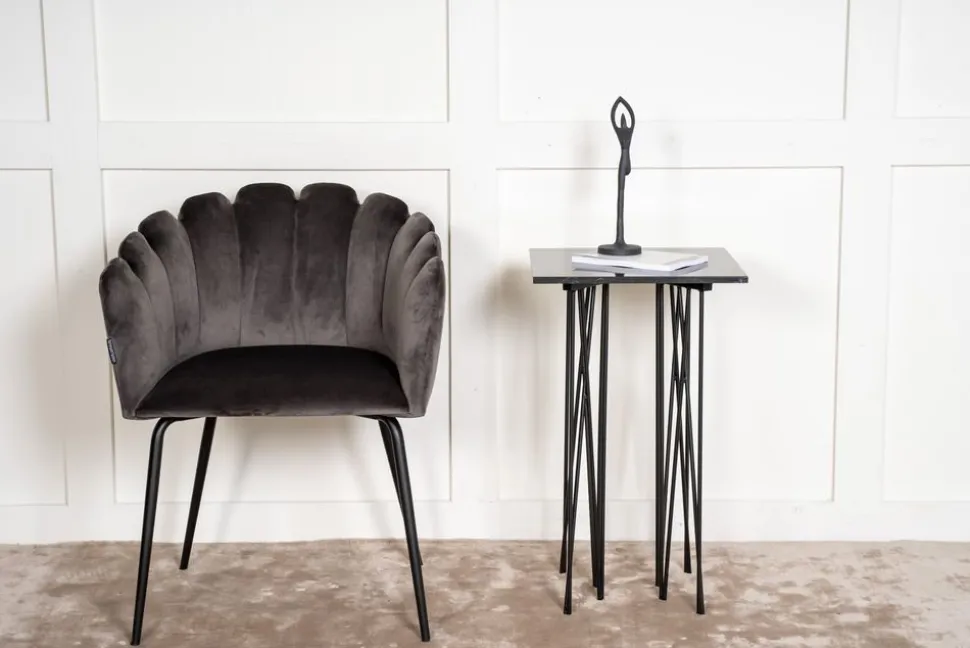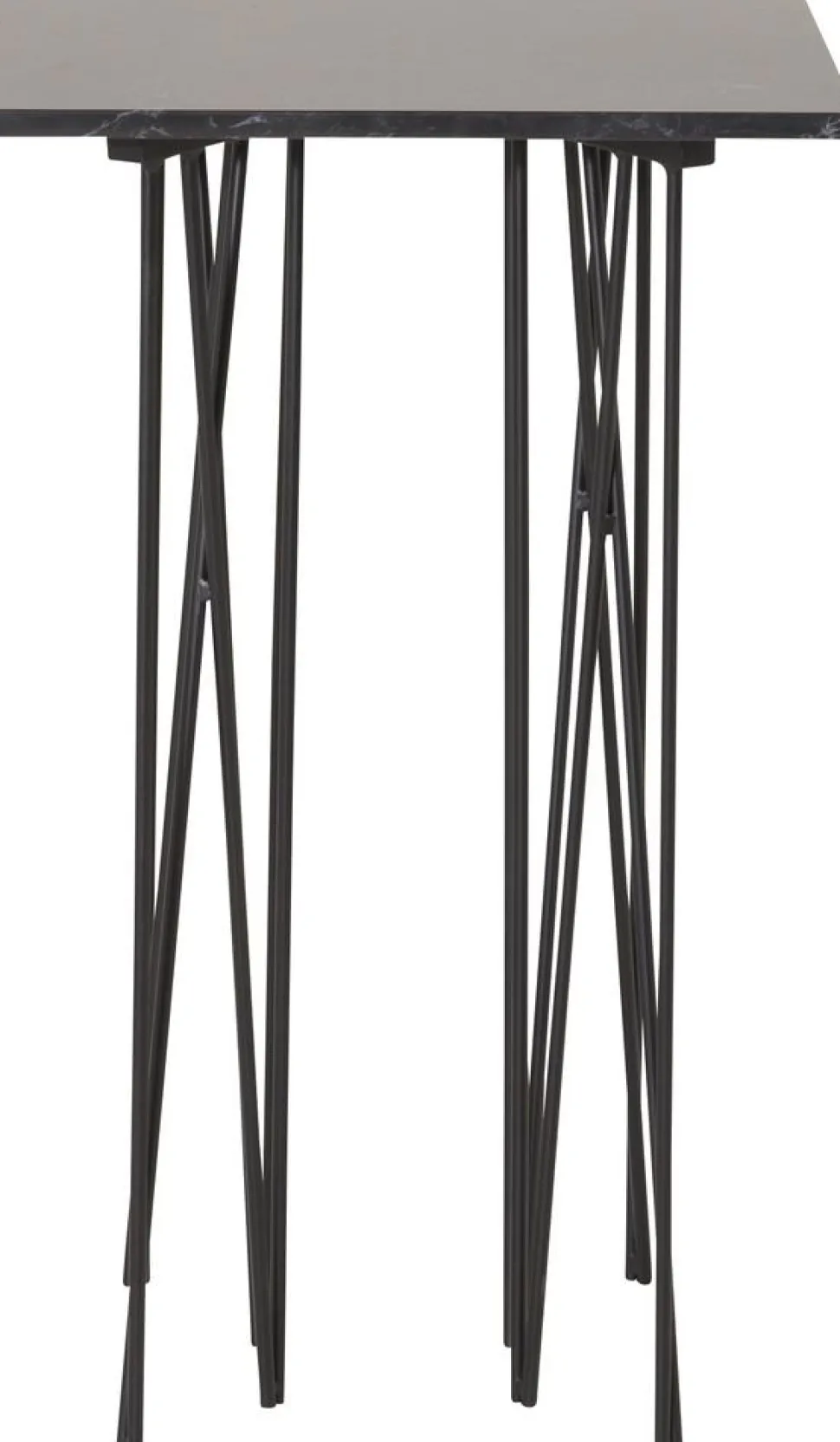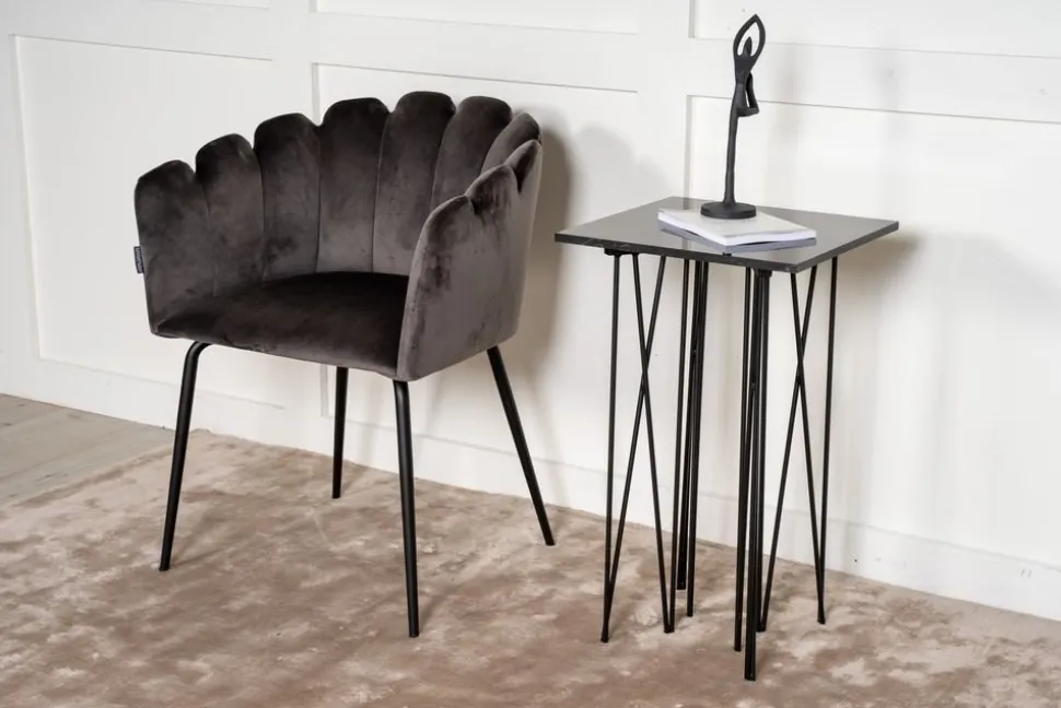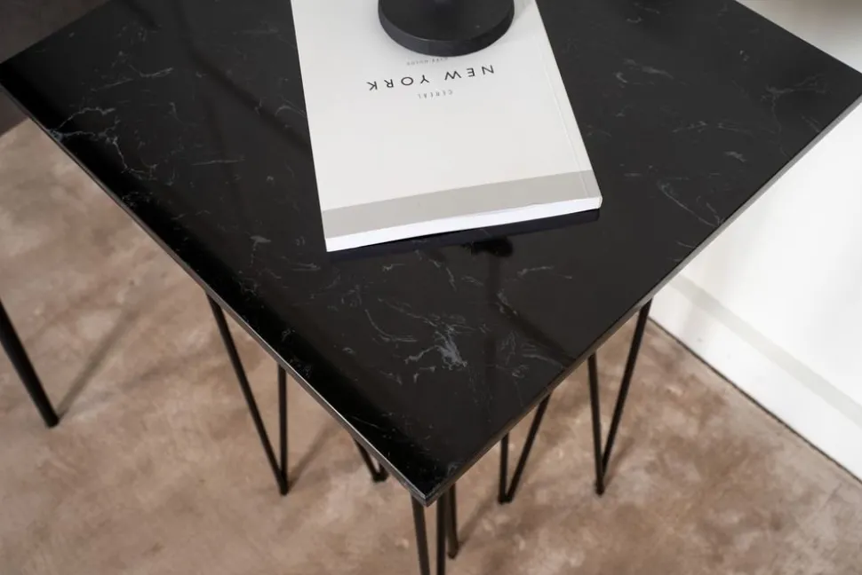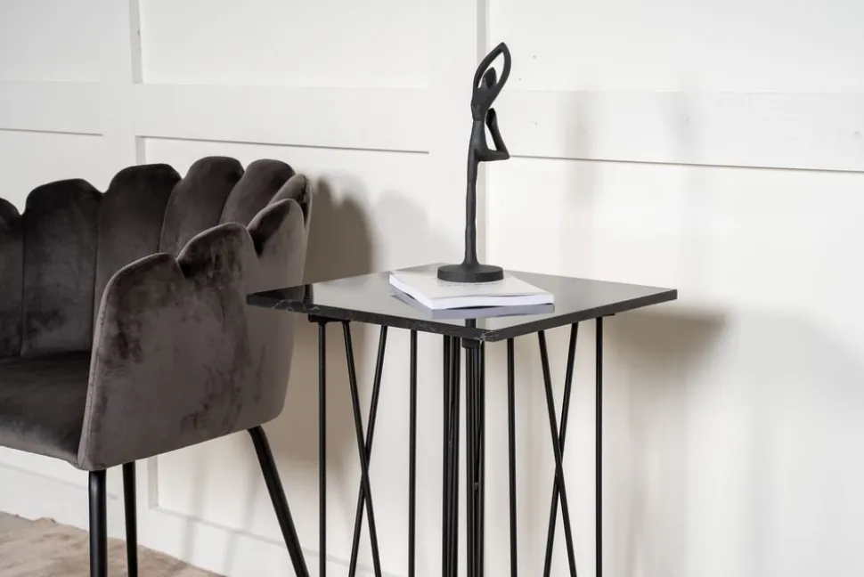 Sidobord med ett karaktäristiskt underrede av svart metall och svart toppskiva i stenmaterial. Alborga serie innehåller även soffbord i samma stil.