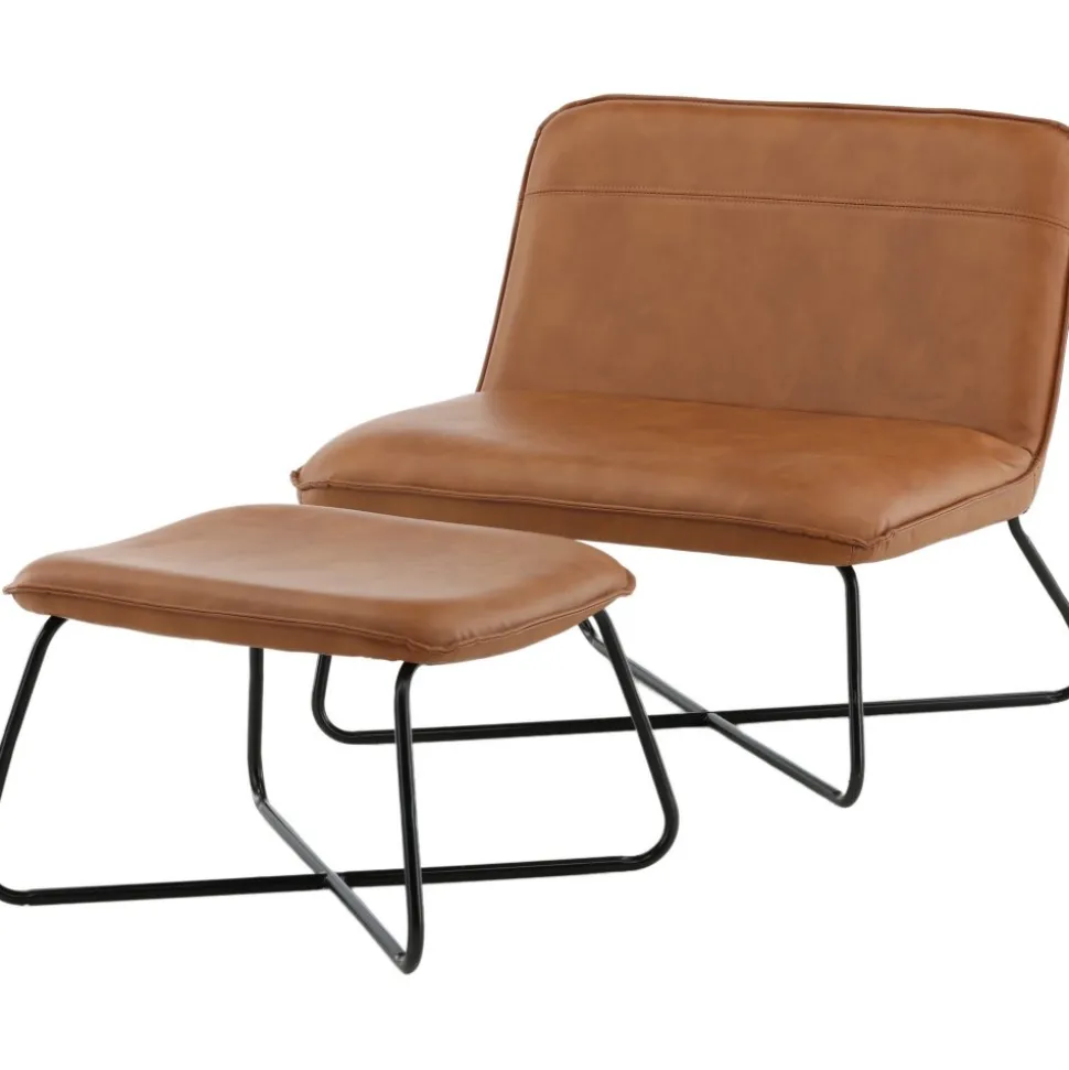Fåtölj och fotpall av trä och järn, klädd med PU-läder.