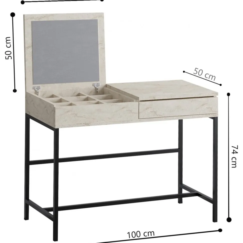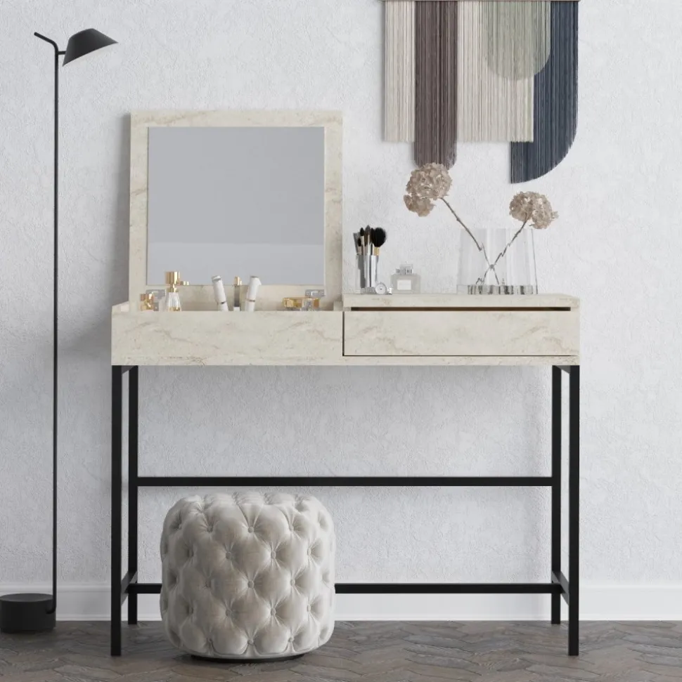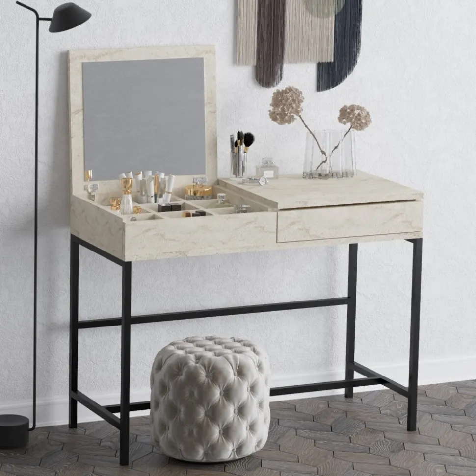 Sminkbord av melaminbelagd spånskiva och ben av metall.