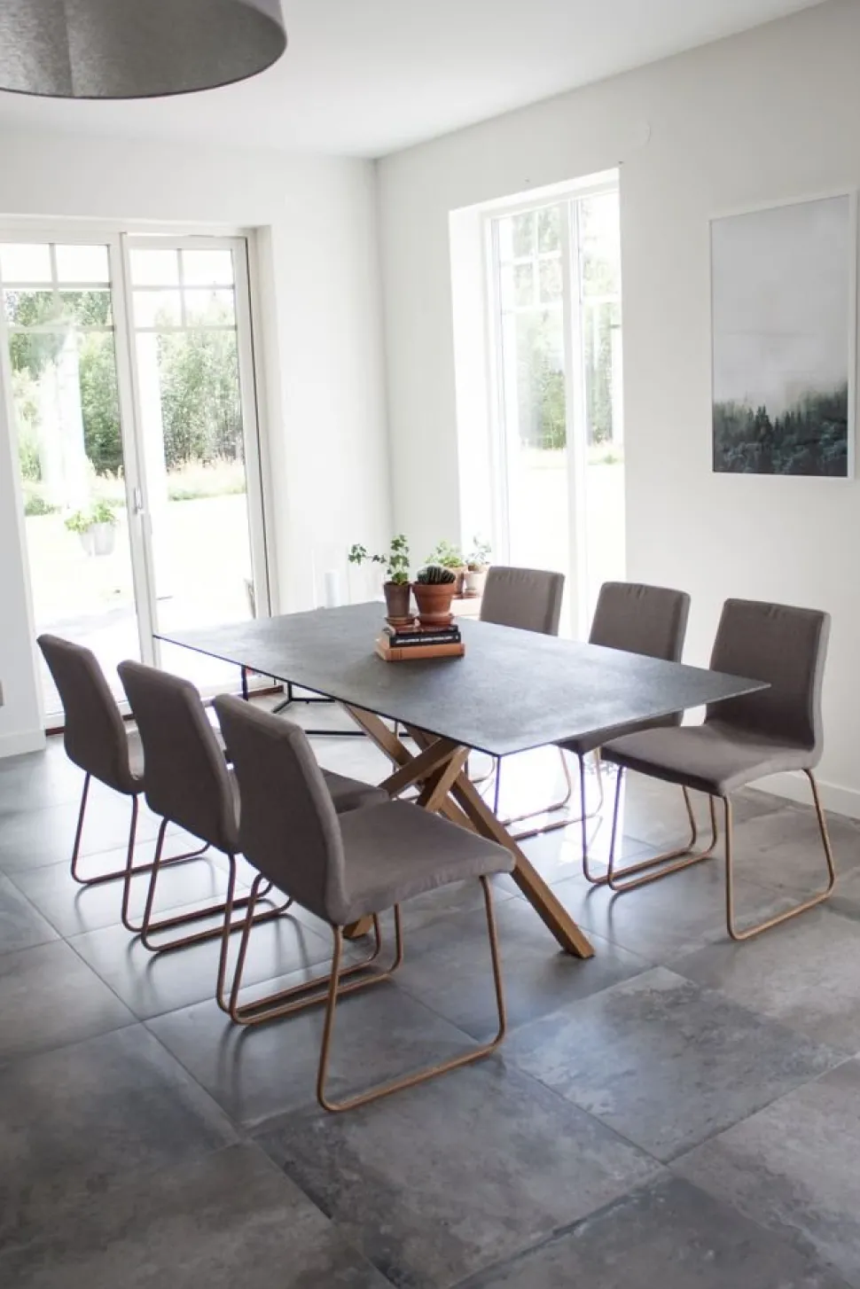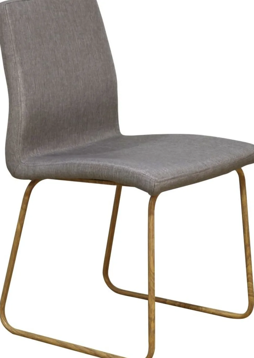 Stol klädd i grått tyg, 100% polyester. Ben av metall med mönster av ek.