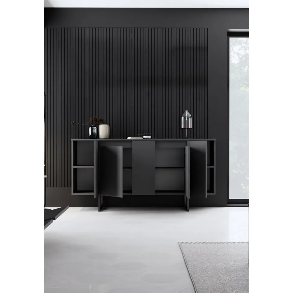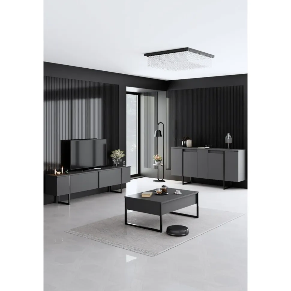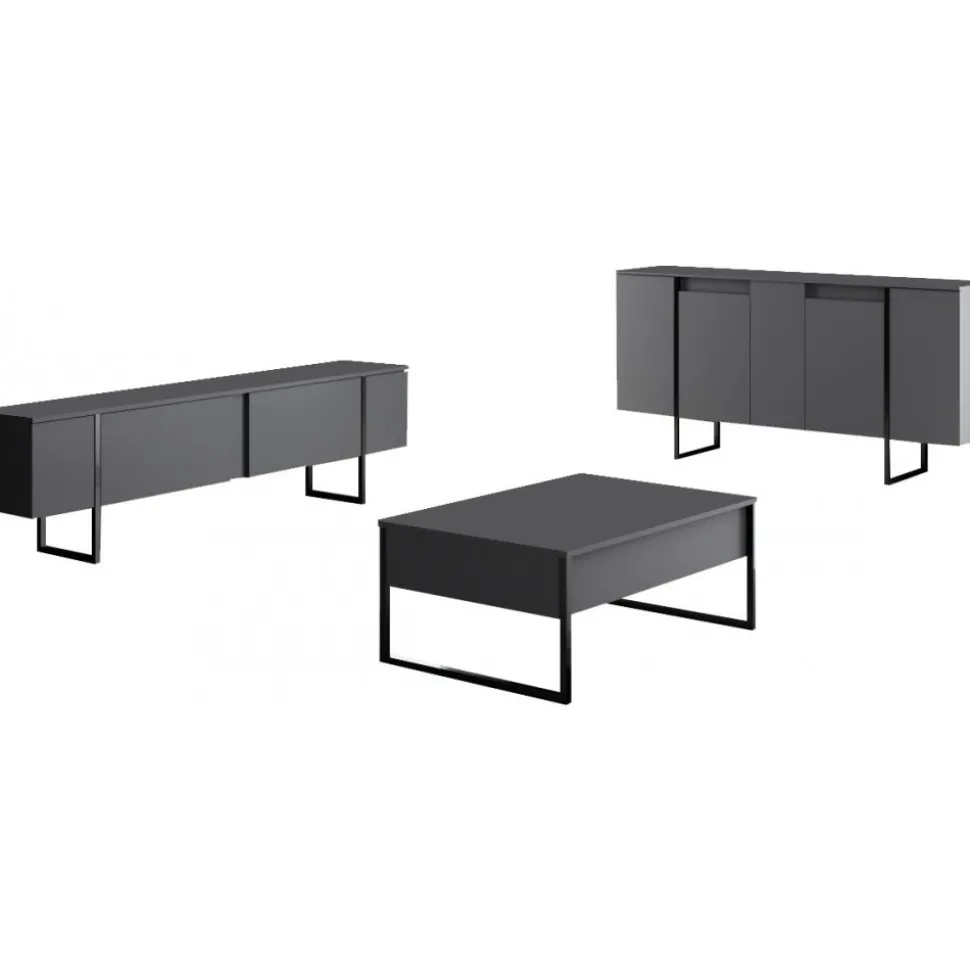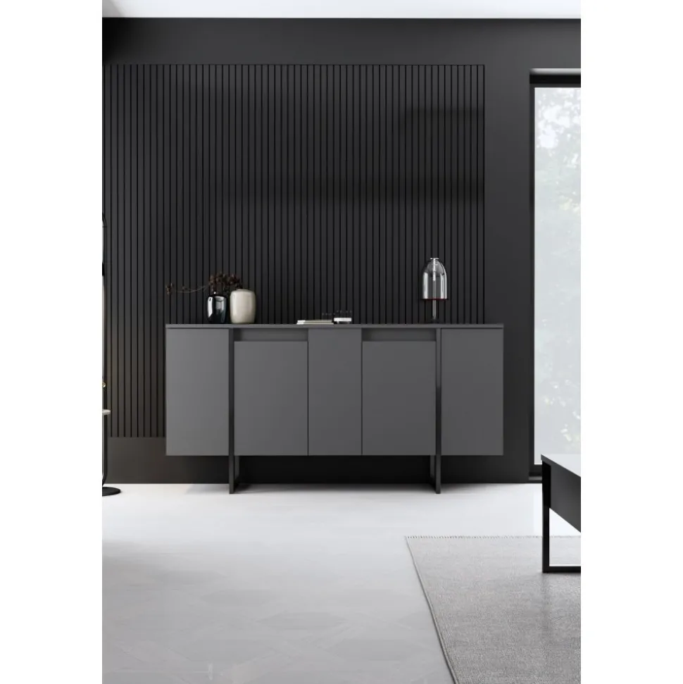 Skänk av spånskiva med ben av metall.