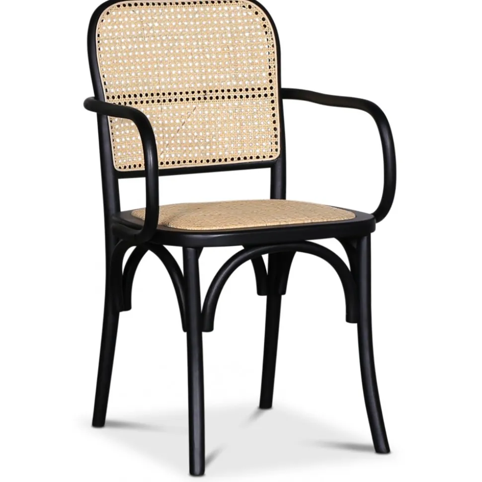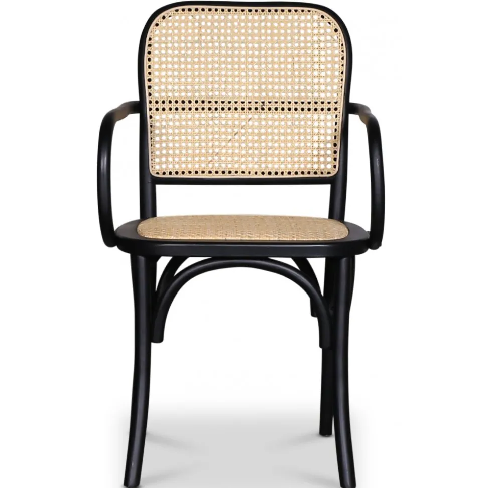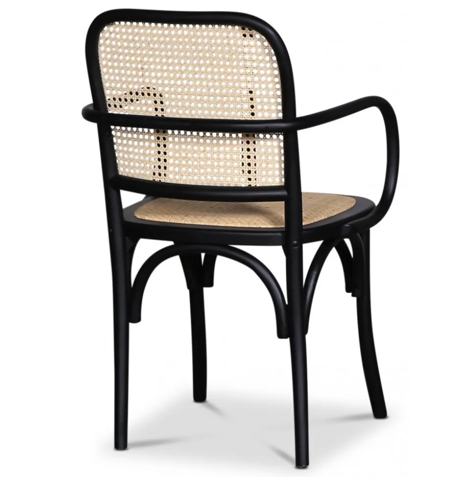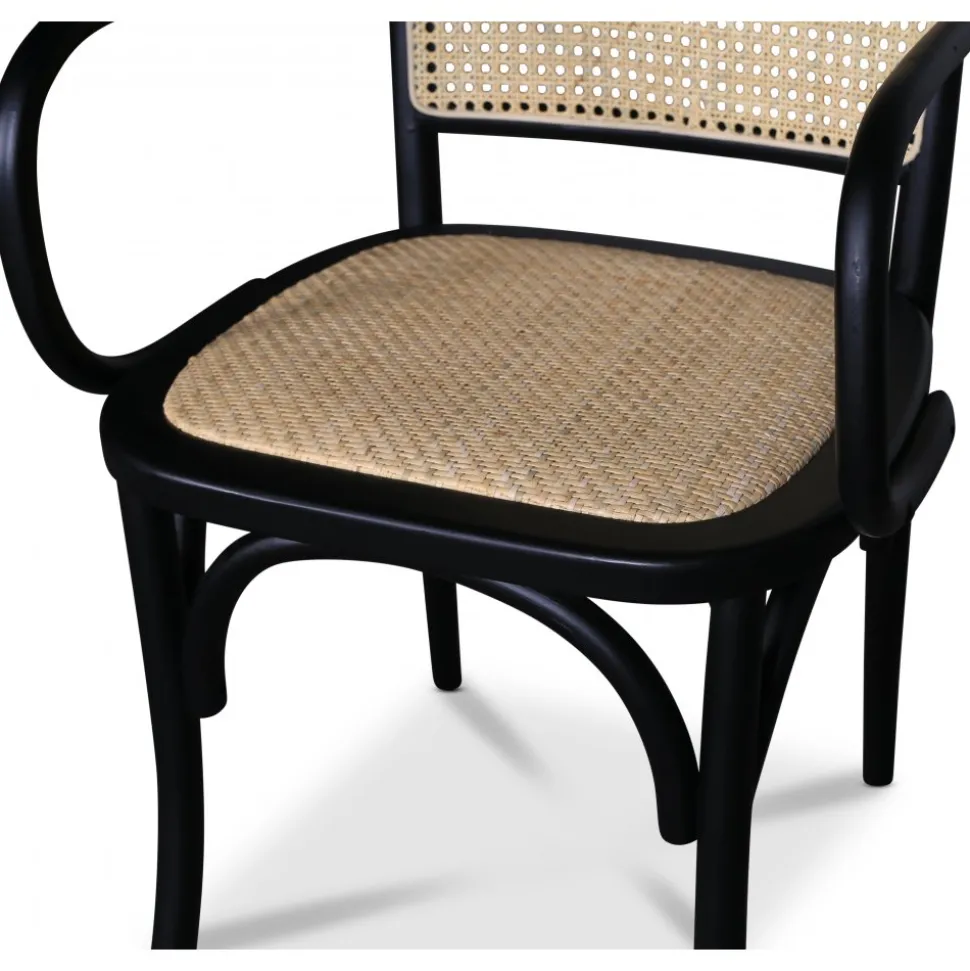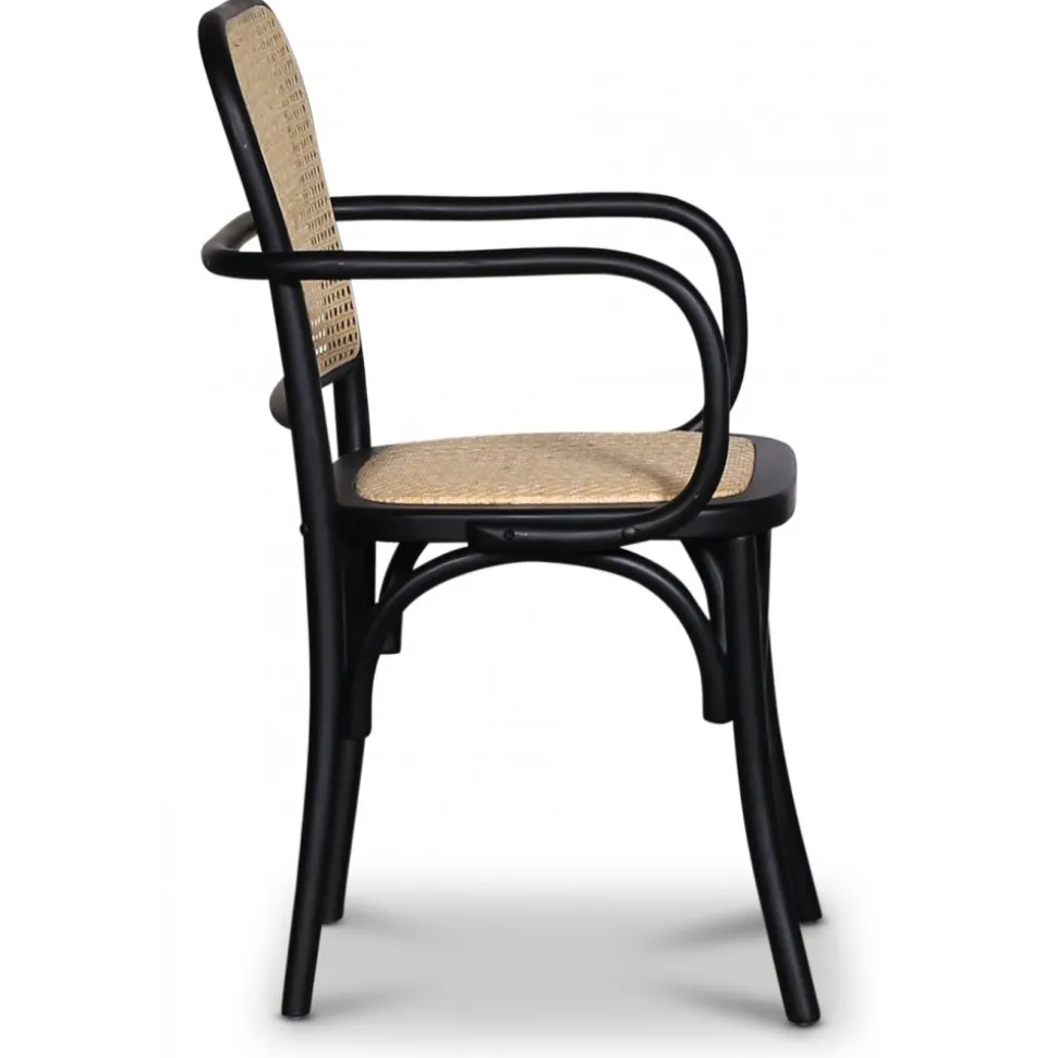 Karmstol i svart böjträ av svartlackad bok, sits- och rygg av naturfärgad rotting. Klassisk matstol som passar till de flesta köksbord.