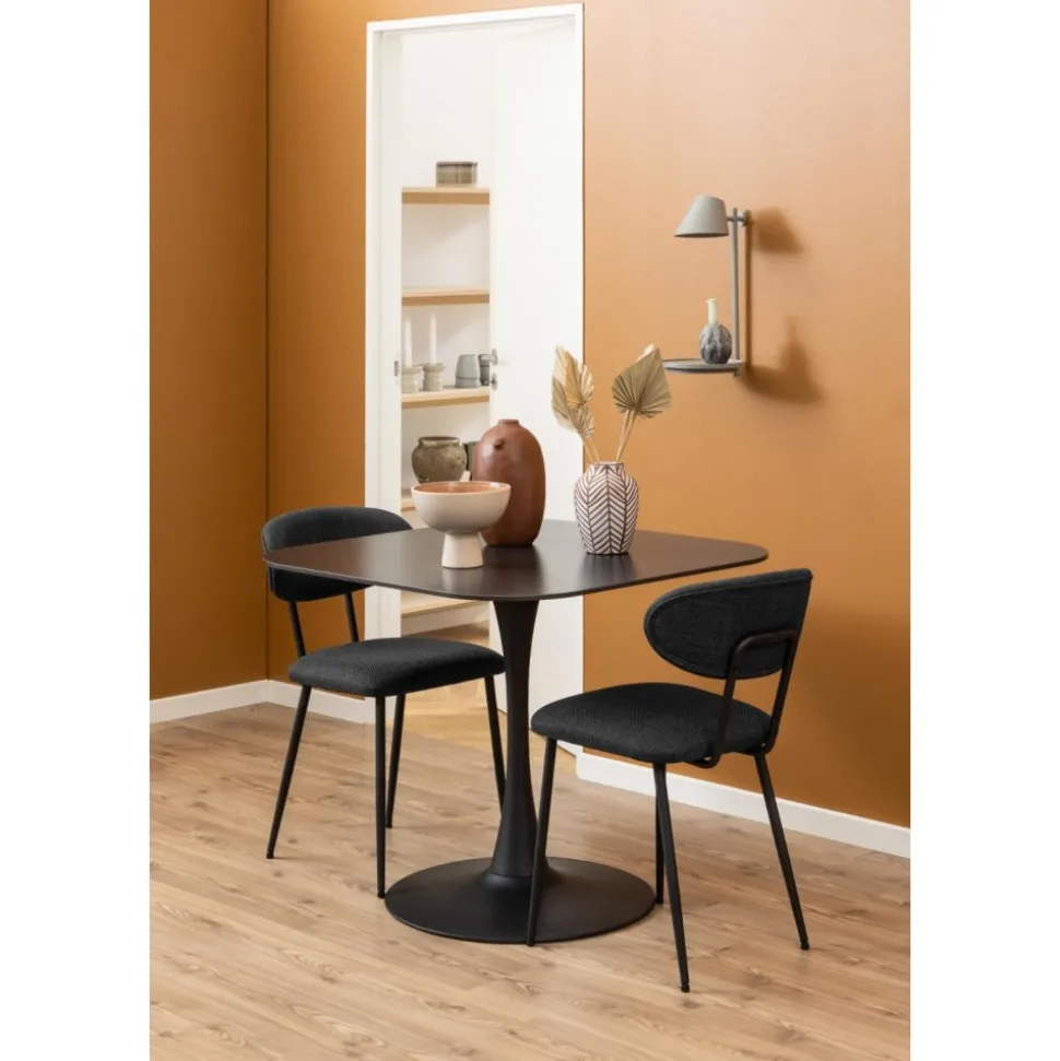 Matbord med bordsskiva av keramik och underrede av pulverlackerad stål. Bordsskivan är både värmebeständig och reptålig.