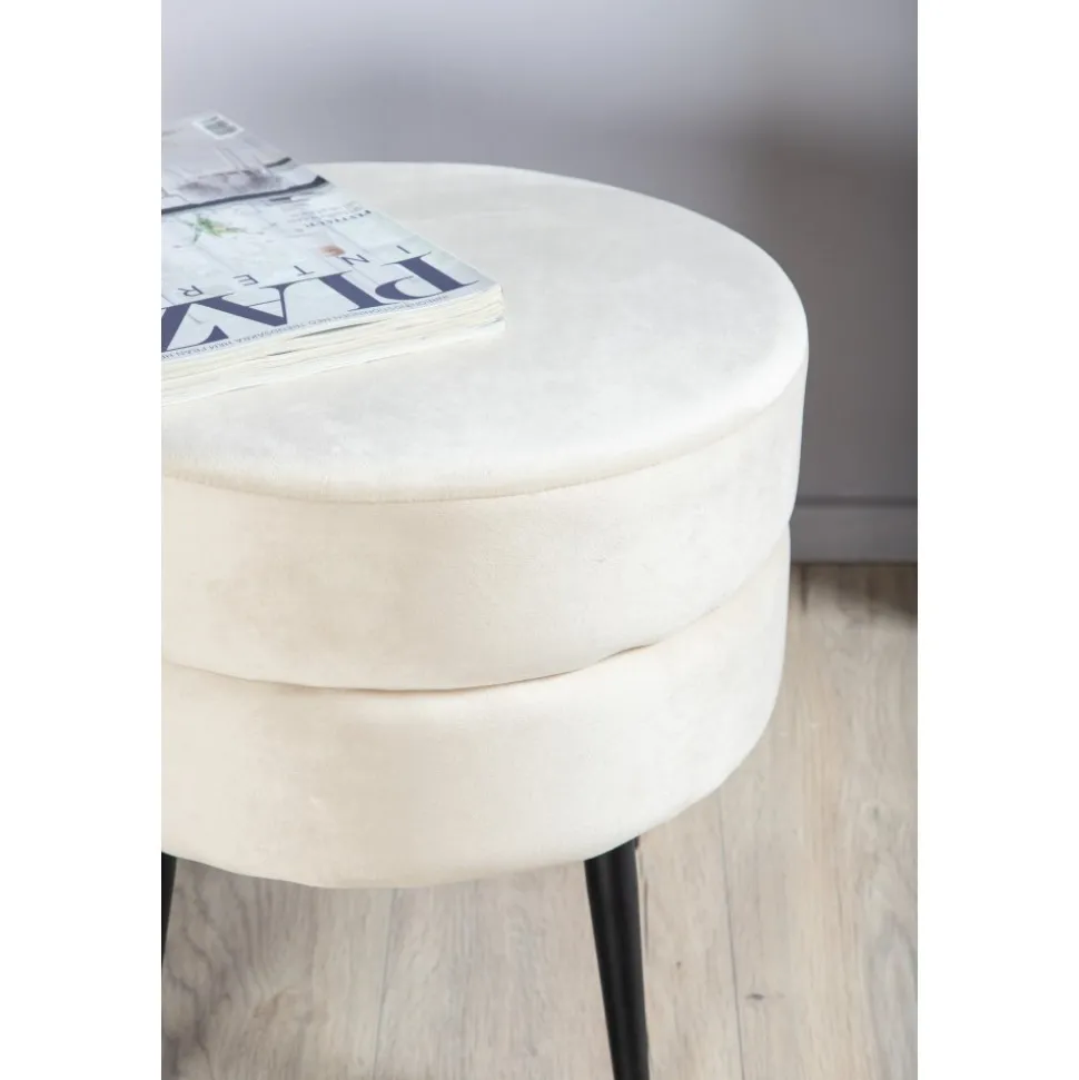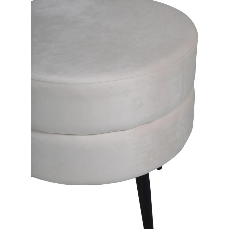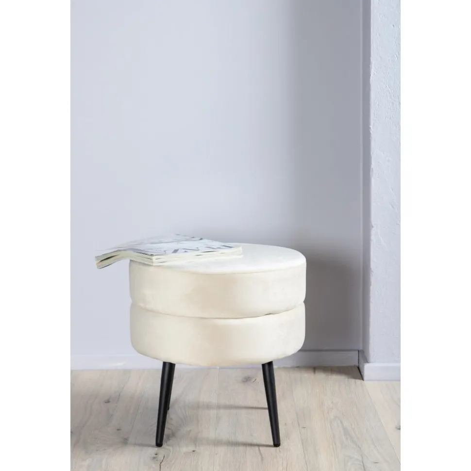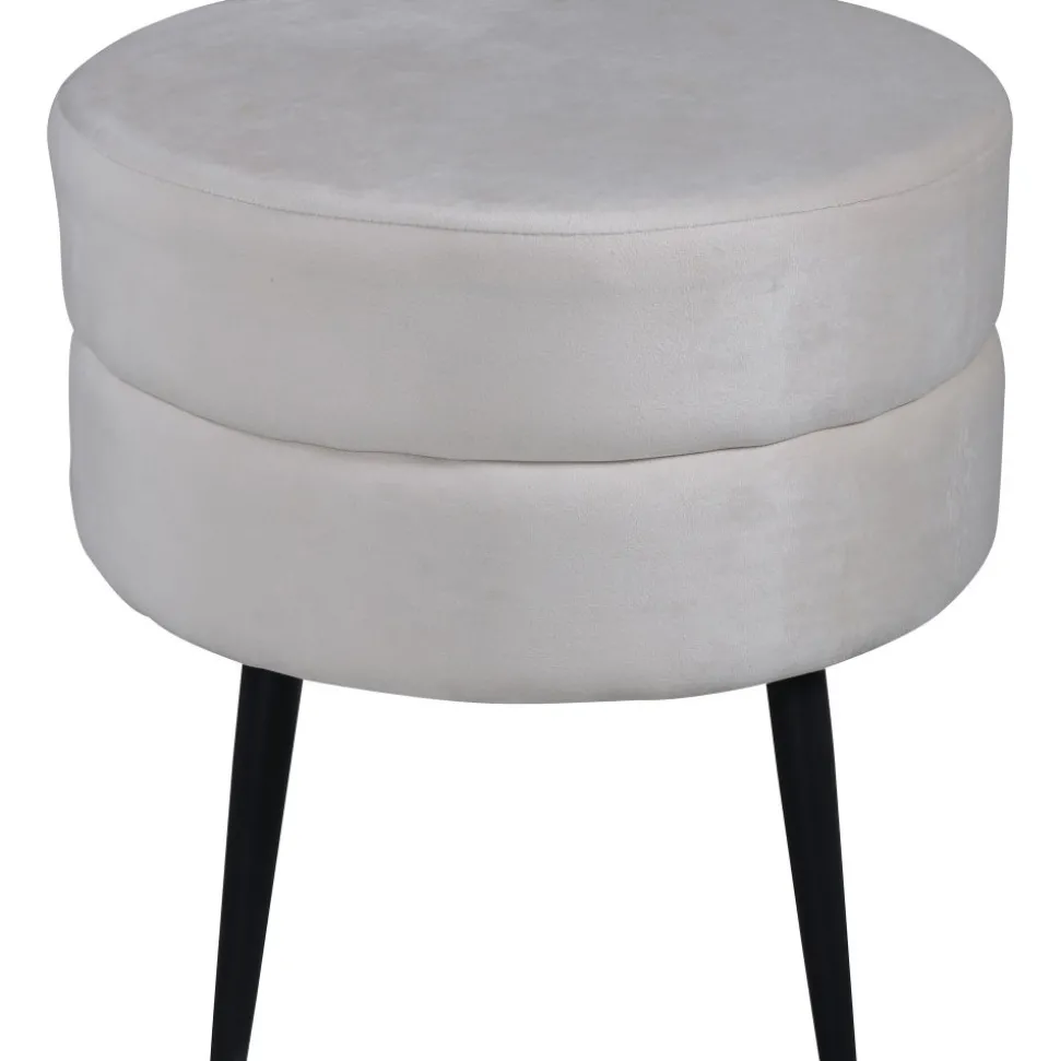 Sittpuff av trä och stål, klädd med polyestertyg.
