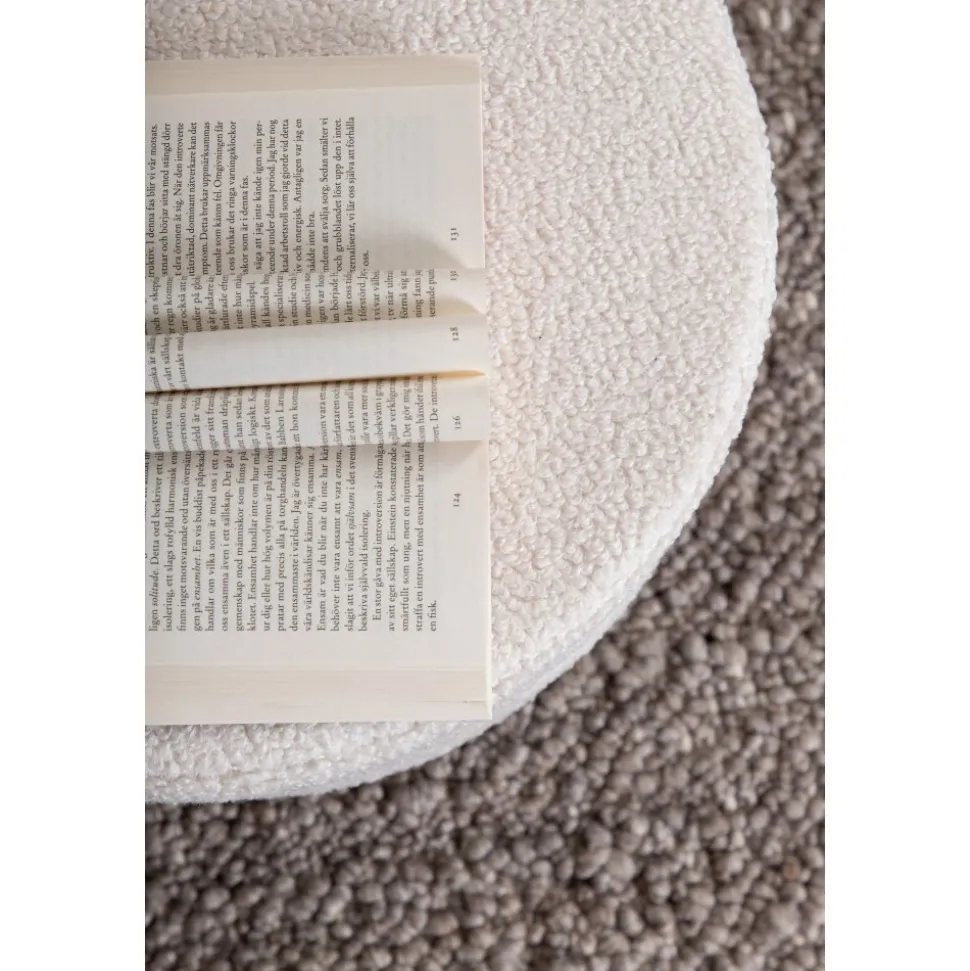 Sittpuff av trä och stål, klädd med polyestertyg.