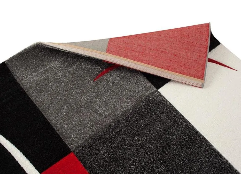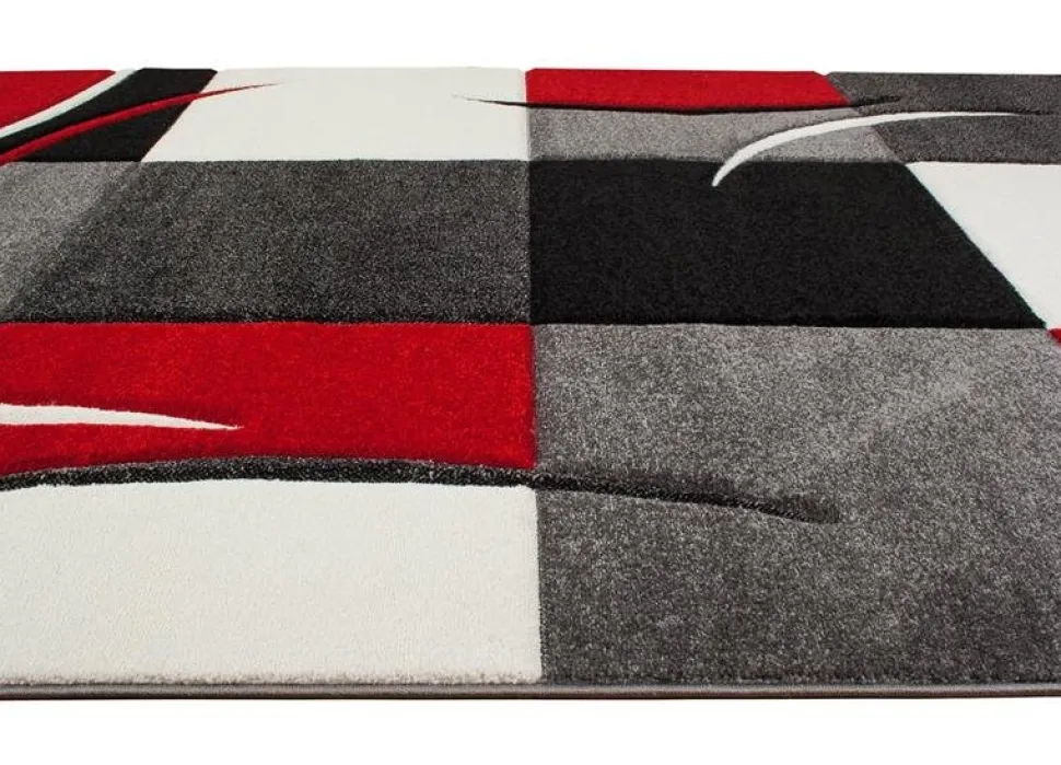 Rivoli är en frizematta som har ett snyggt rutmönster och detaljer som går i färgerna vit, svart, grå och röd. Mattan har en kort skuren lugg och är maskinvävd i polypropylen, vilket är ett syntetmaterial som är lätt att rengöra och hålla fri ifrån ludd och damm. Eftersom den har korta fibrer så tränger inte smuts in lika lätt som på en med längre fibrer och den är även resistent mot de flesta fläckar. Rivoli är gjord i carvingteknik, vilket innebär att den är gjord med utskärningar för att på så sätt få färger och detaljer mer framträdande och ge en större effekt.