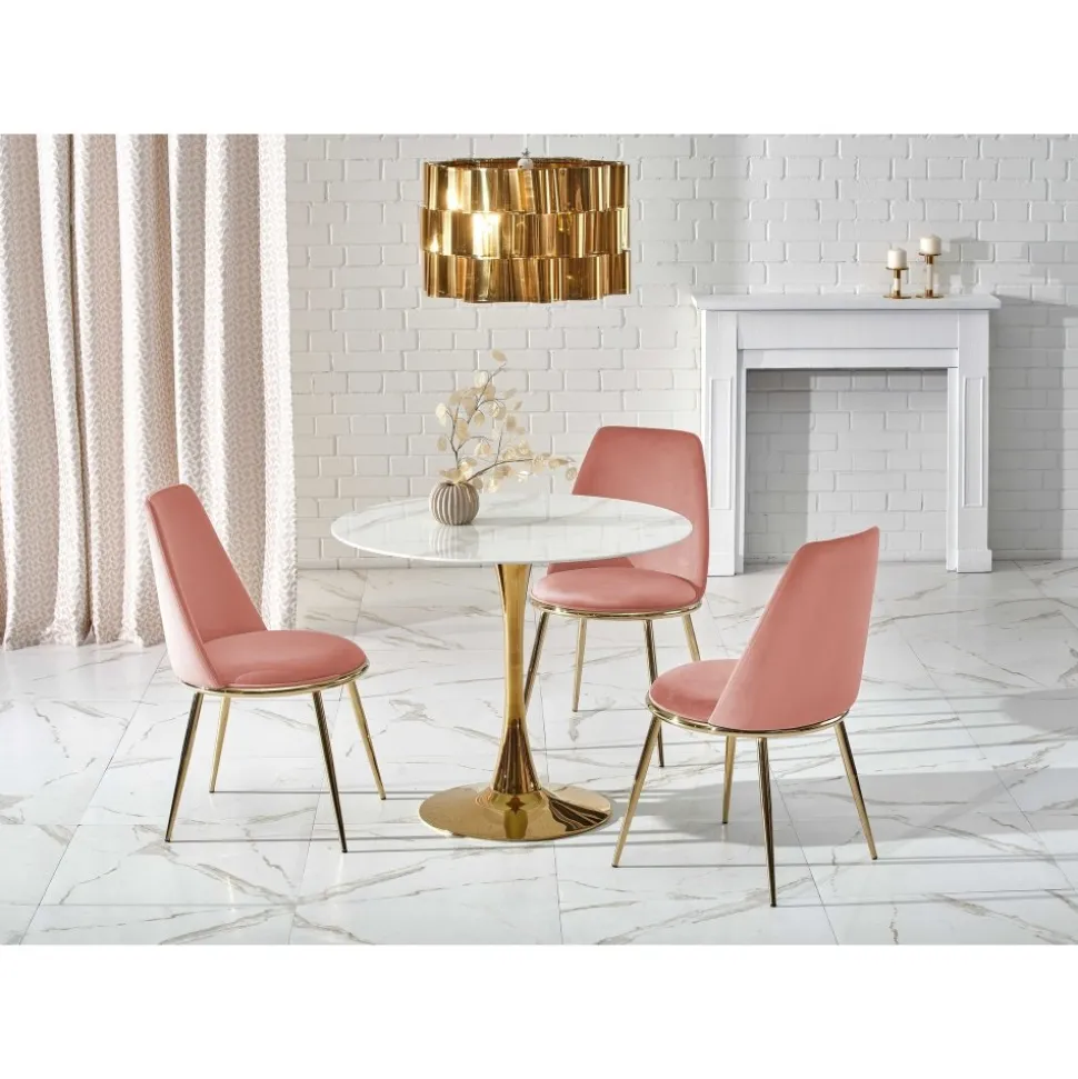 Matbord med bordsskiva av marmorerat glas och underrede i guldig metall.