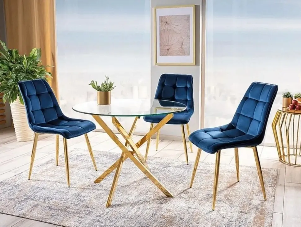 Matbord av blank guldiga ben. Bordsskiva av tempererat glas.