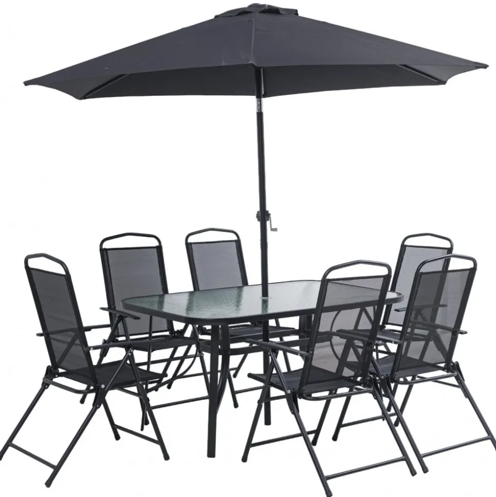 Växjö utegrupp är en komplett matgrupp som består av sex fällbara positionsstolar med svart metallstomme och bekvämt textilene-tyg. Till gruppen hör även ett matchande parasoll samt ett rektangulärt bord med en elegant, vågformad glasskiva. Den nätta designen gör utegruppen enkel att placera på både altan och uteplats. Parasollen öppnas och stängs smidigt med ett vevhandtag och kan dessutom vinklas för att ge optimal skugga.