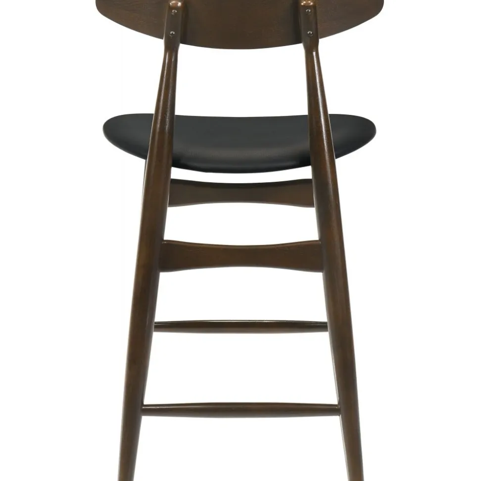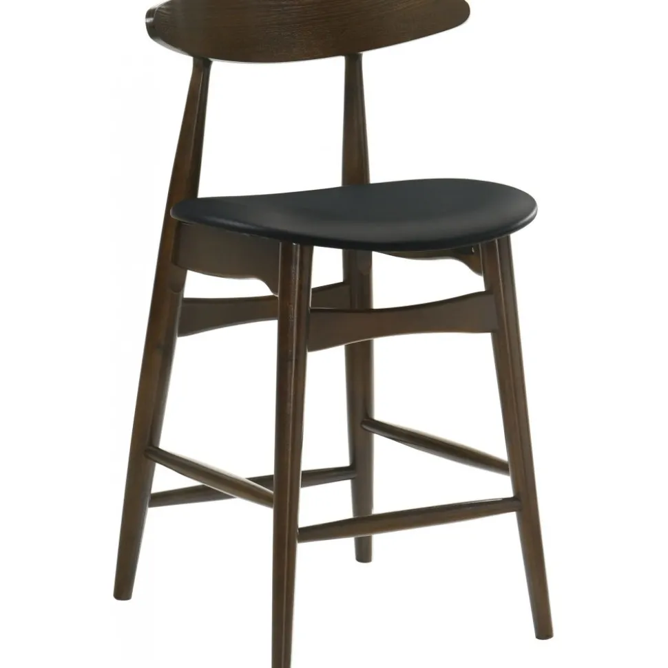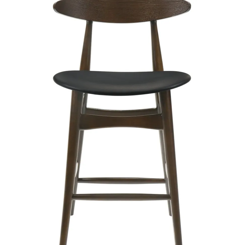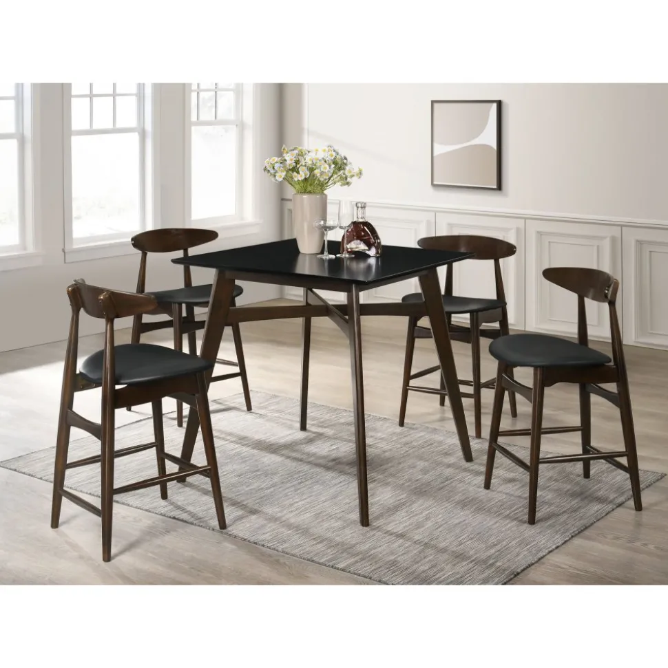 En komplett i barhöjd bestående av ett fyrkantigt barbord och fyra barstolar. Bordet har ett underrede i valnöt och en svart toppskiva. Barstolarna är tillverkade i samma stil med underrede i valnöt och en sits i svart PU. Stolarna har ett svängt ryggstöd för ökad sittkomfort.