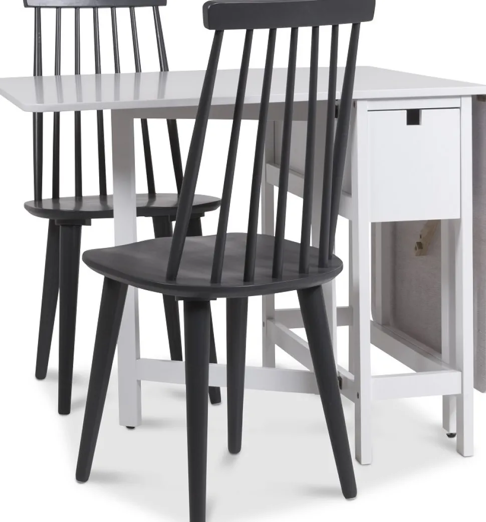 Matgrupp – Klaffbord med 2 grå pinnstolar: