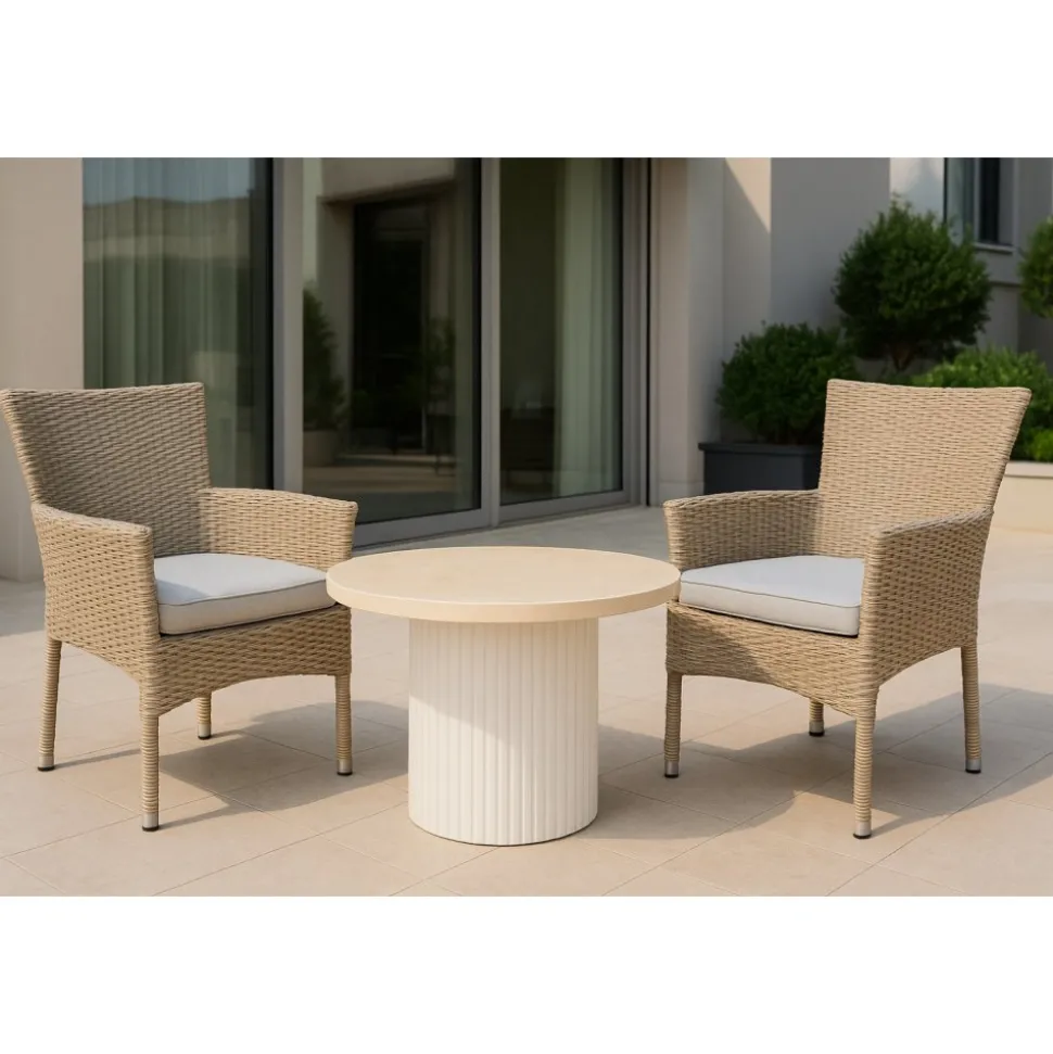 Denna matgrupp passar utmärkt för mindre uteplatser eller balkonger där en stilren och funktionell möbel önskas. Bordet från Merca-serien har en rund bordsskiva med travertinprint på en folierad och vädertålig yta som ger ett naturligt uttryck. Bordet är anpassat för utomhusbruk men bör skyddas vid kraftigt regn och förvaras torrt under vintern för att behålla sin finish.