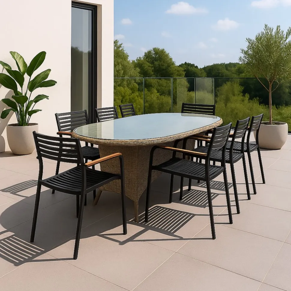 Denna matgrupp kombinerar ett matbord i klassisk rottingdesign med sex eleganta karmstolar. Bordet har en stomme klädd med naturfärgad konstrotting och en bordsskiva av tempererat glas, vilket ger en stilren och tålig yta för utomhusbruk. Stolarna är stapelbara och har en modern design med svartlackad metallstomme och sitt-/ryggdelar i tålig plast med träliknande noonwood-utseende, vilket gör dem både bekväma och lättplacerade.