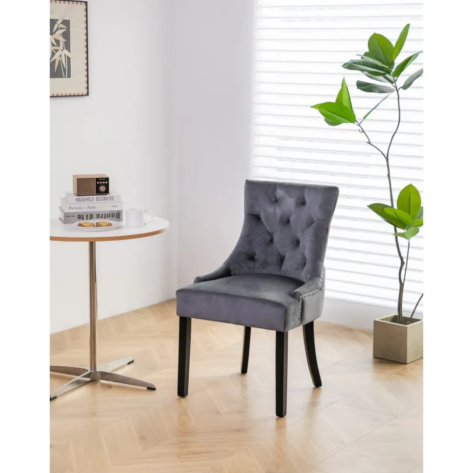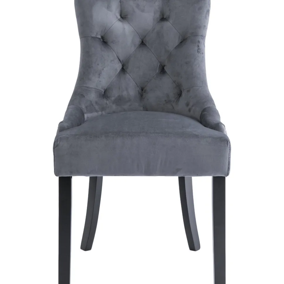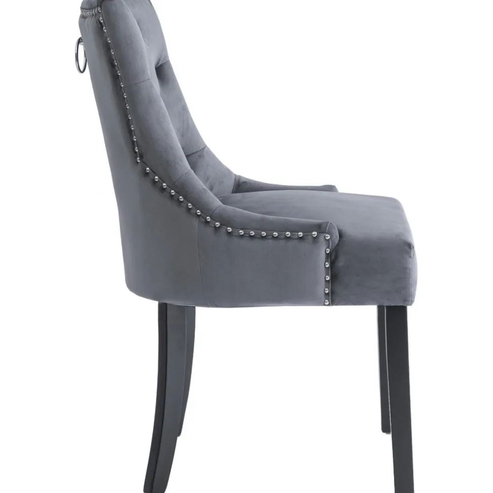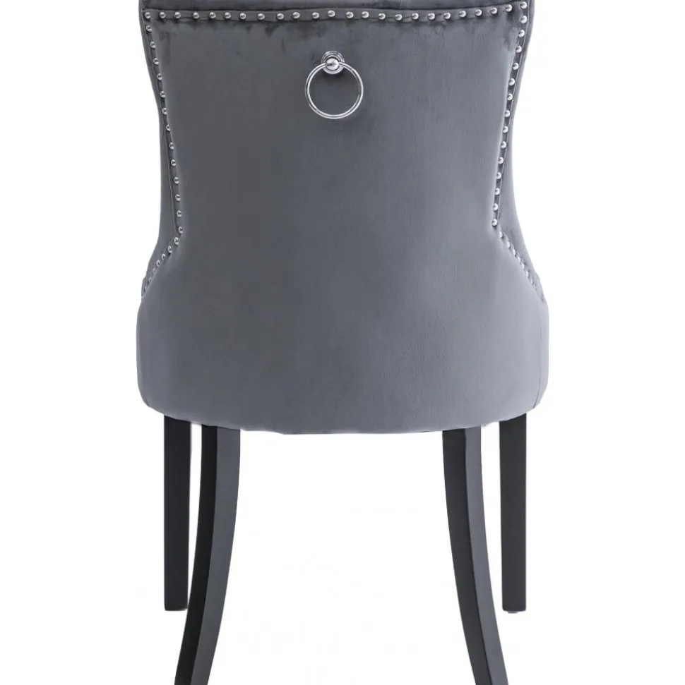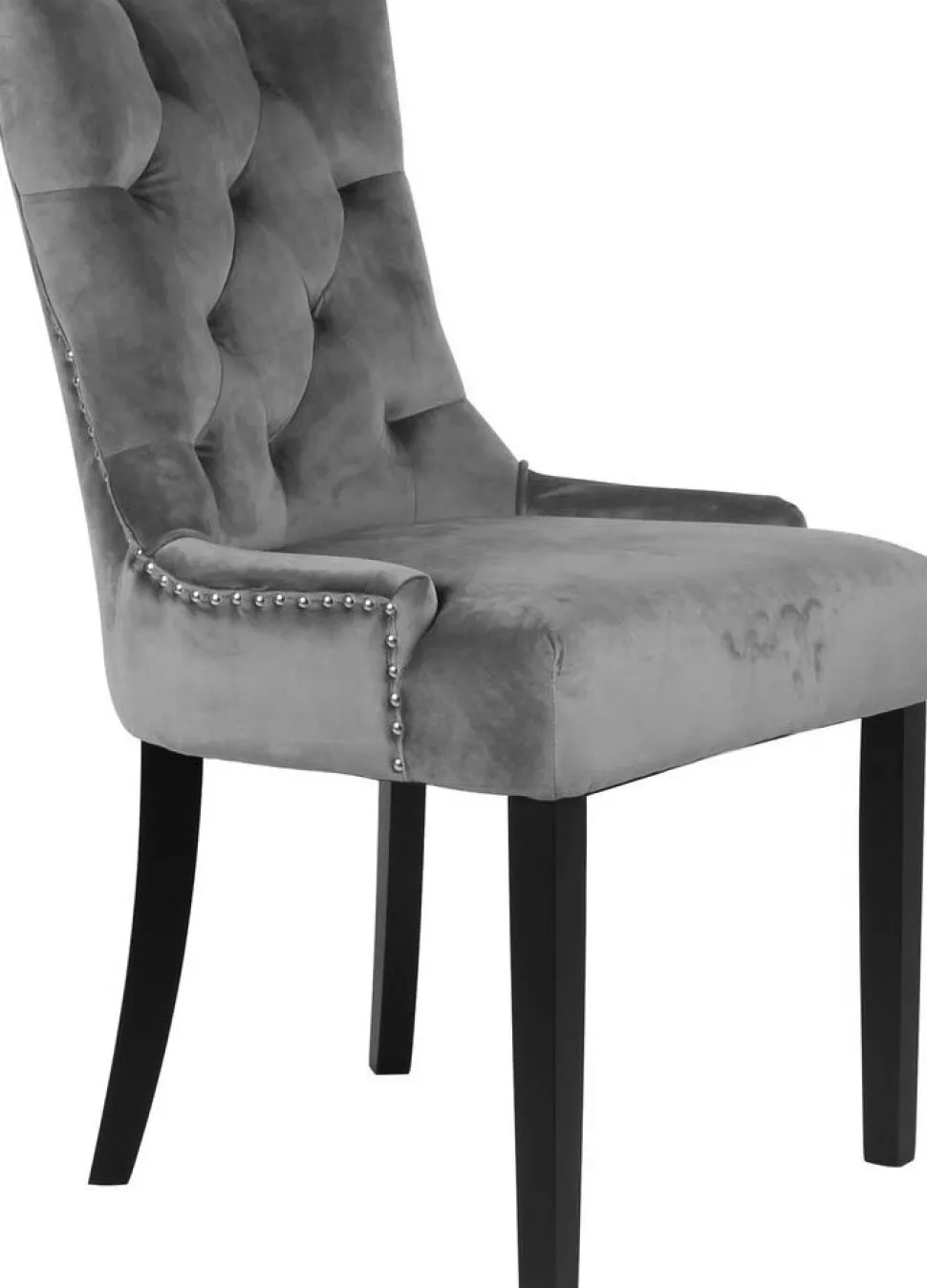 Matstolen Tuva är en stilren i grå sammet med kromade nitar och ett kromat handtag på ryggen som ger en elegant och inbjudande känsla. De svartlackade träbenen bidrar med ett tidlöst uttryck, vilket gör stolen lätt att kombinera i olika matsalsmiljöer.
