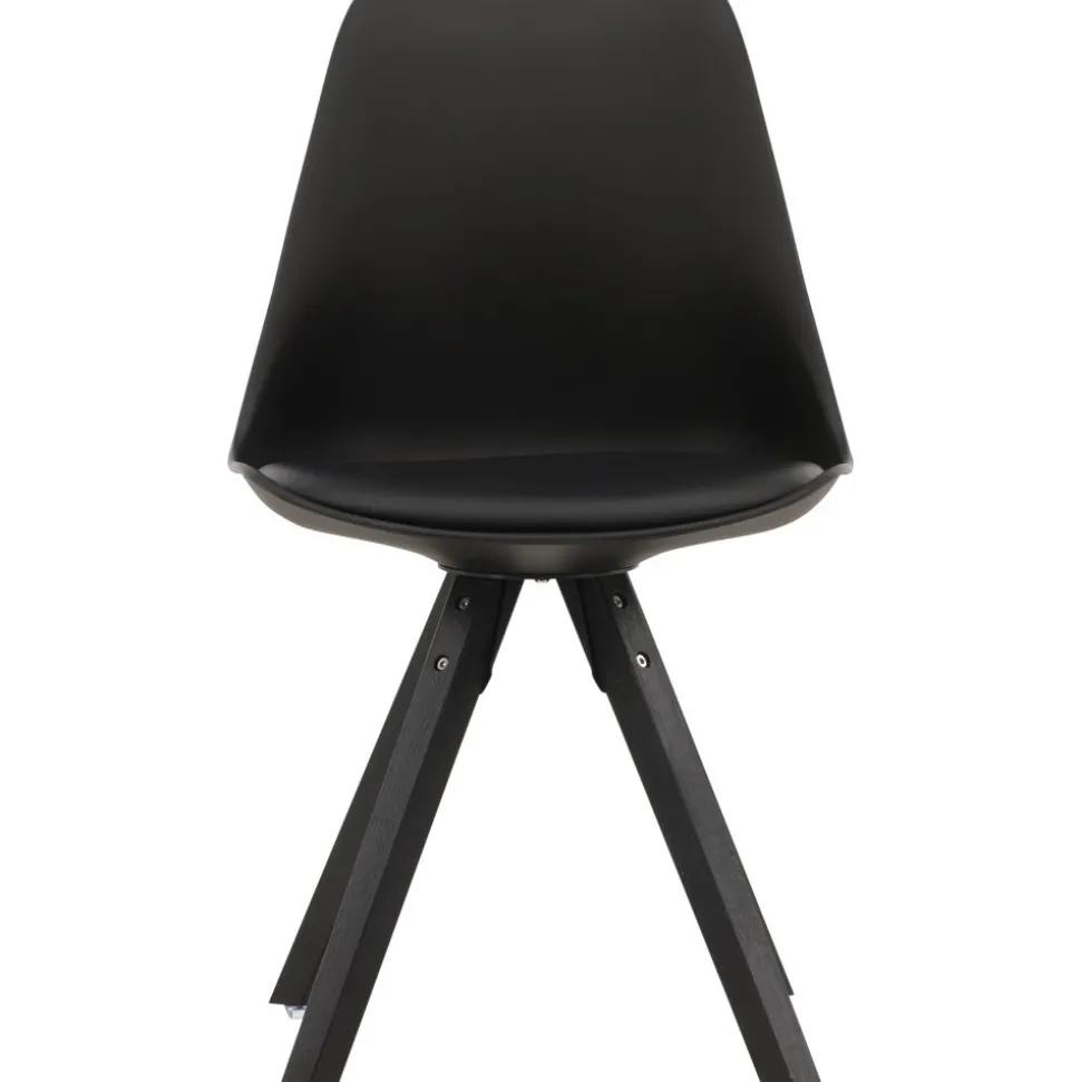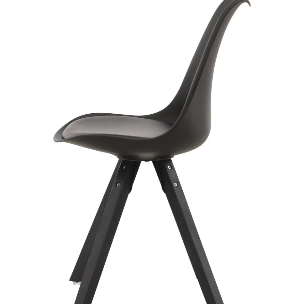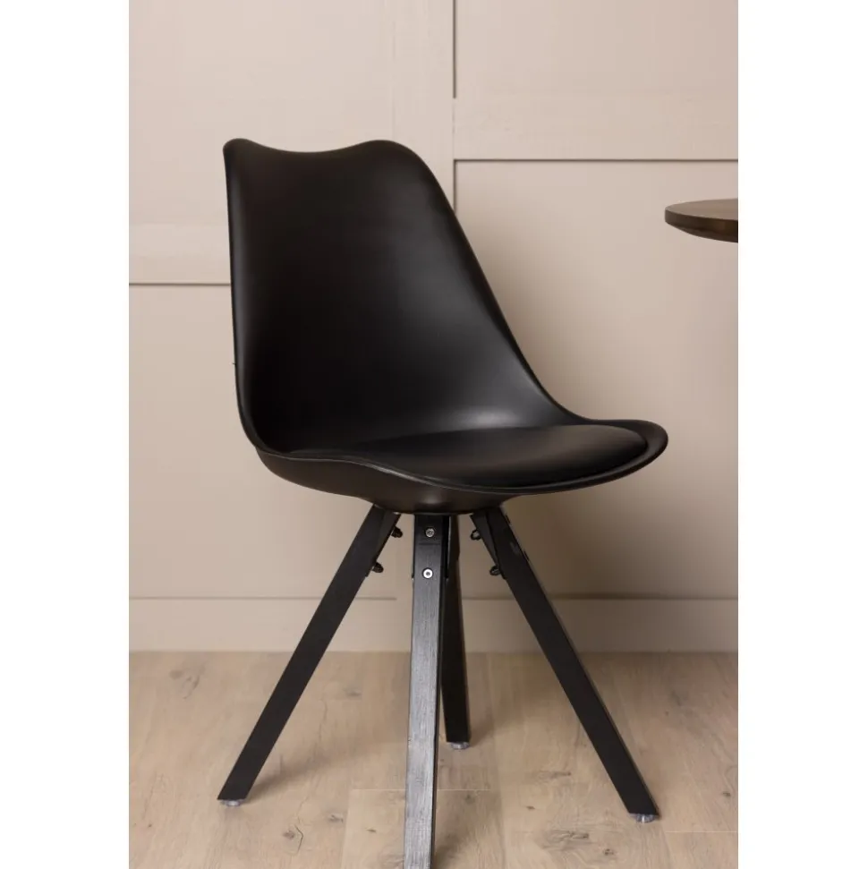 Matstol i en tuff helklädd design med ben i trä. Den här stolen har en inbjudande utformning med rygg och sits i svart plast och inbyggd sittdyna med hög komfort. Matcha med ett snyggt matbord och skapa en trivsam mittpunkt i ditt hem. Här sitter du bekvämt och njuter av goda måltider framöver!