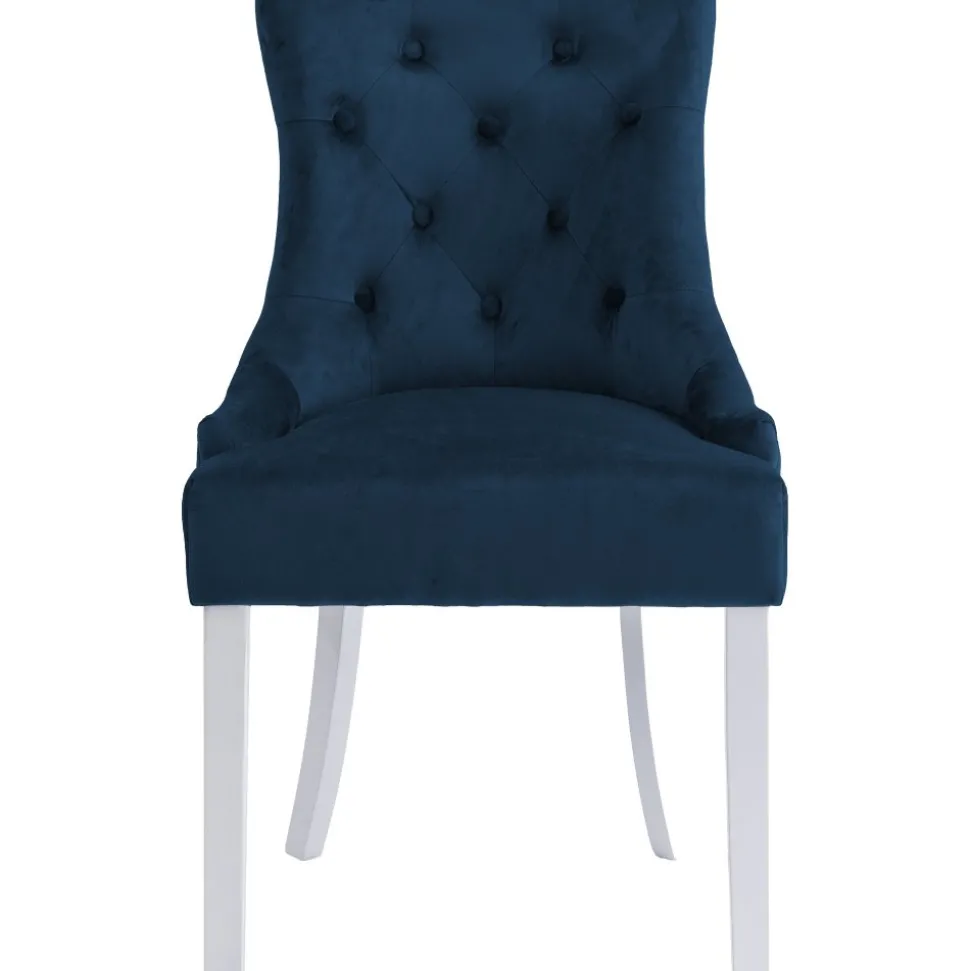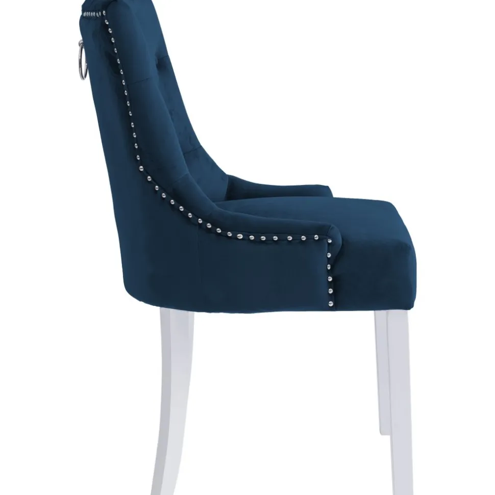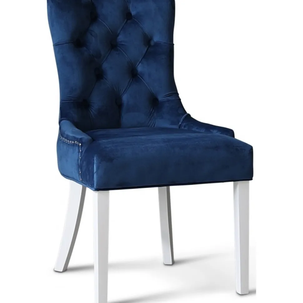 Tuva klädd i ett mjukt och lent sammetsliknande blå tyg med vitlackade ben. Stolen pryds av kromade nitarna som en snygg detalj. Stolen är välarbetad och en av våra mest populära .