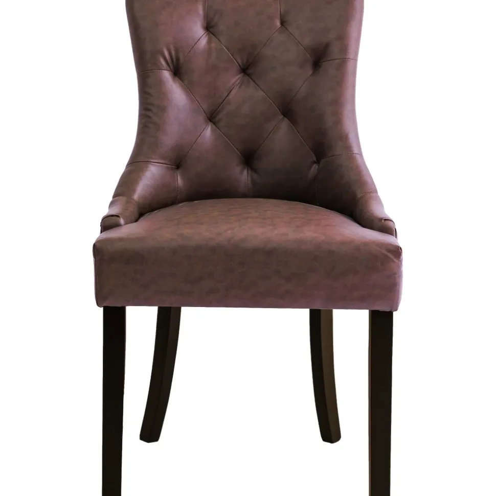 Matstol som kombinerar tidlös stil med modern komfort. Klädd i brunt vintage PU-läder och med matchande bruna ben, ger den en varm och inbjudande känsla till ditt matbord. De antikfärgade nitarna är en smakfull detalj som ger stolen en rustik charm och accentuerar dess klassiska design. Med sin välarbetade konstruktion är Tuva en av våra mest populära matstolar, perfekt för både vardagligt bruk och mer festliga tillfällen. Ge din matsal en sofistikerad touch med Tuva-stolen!