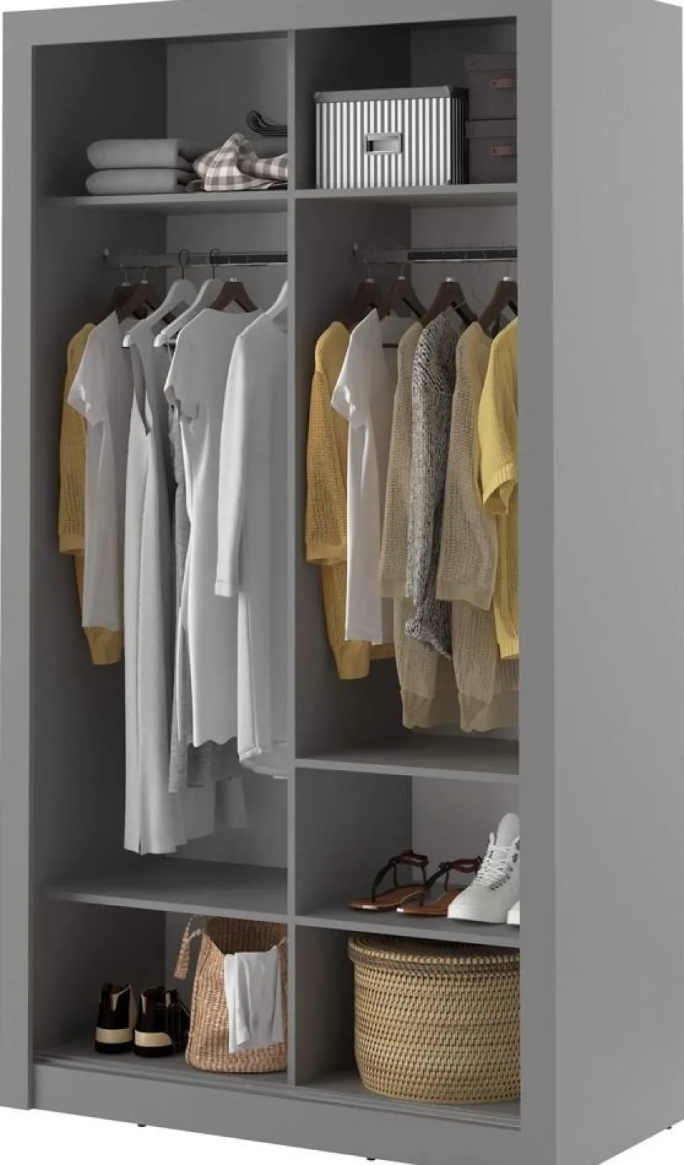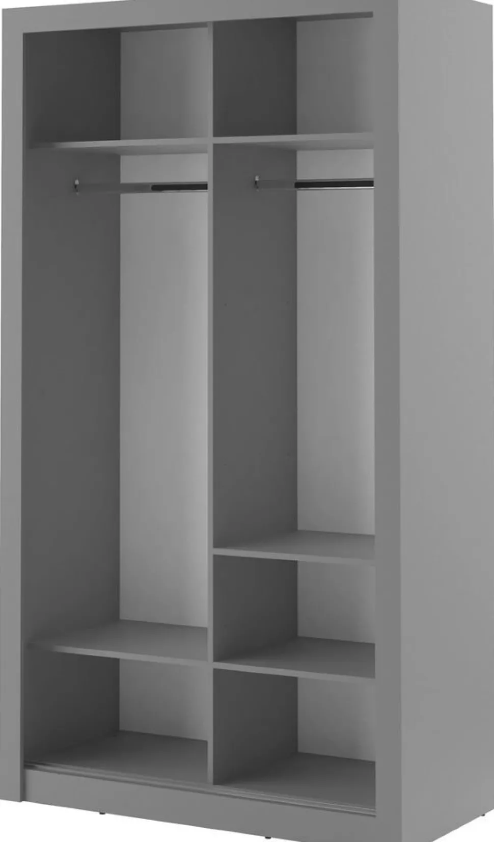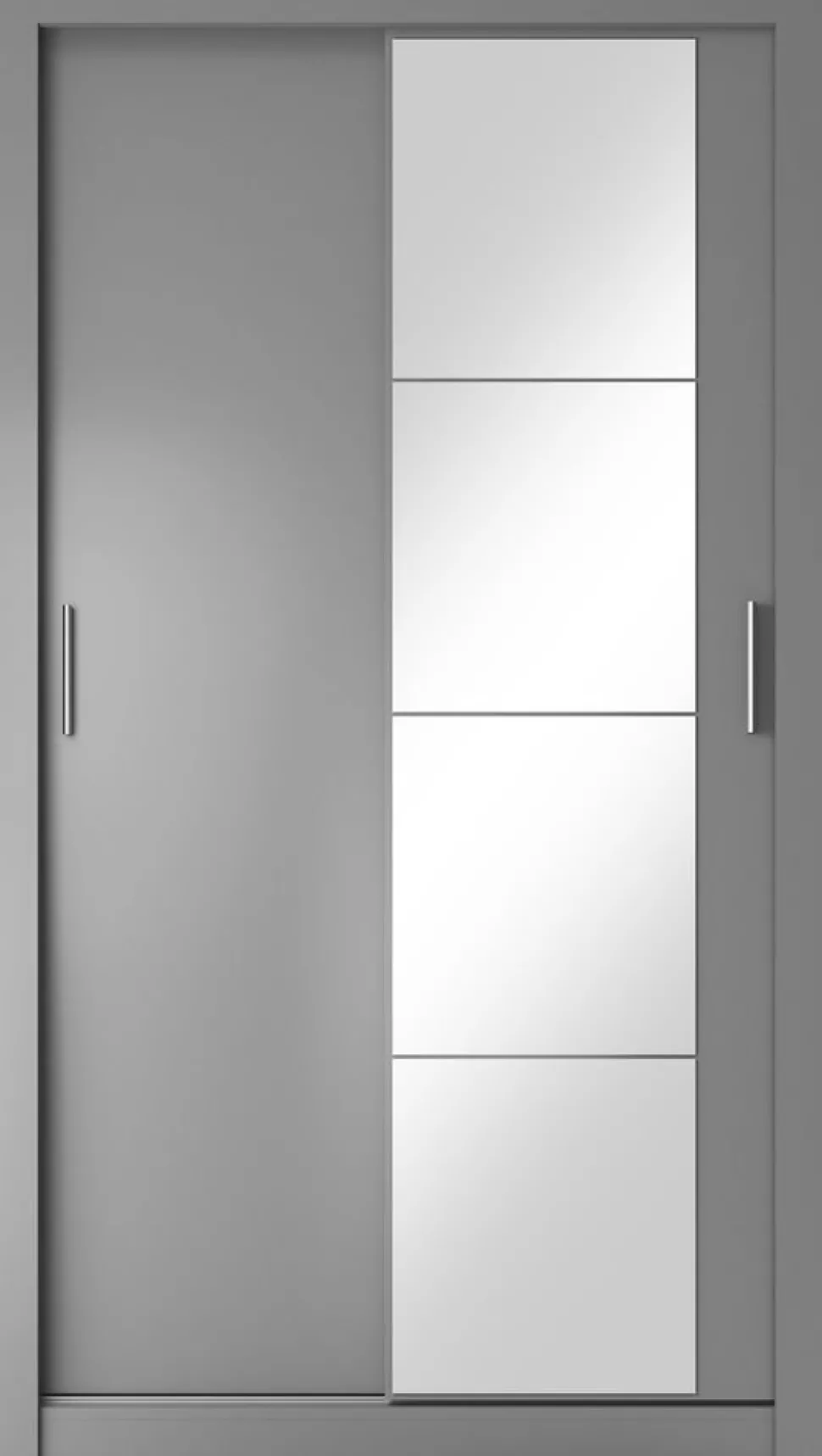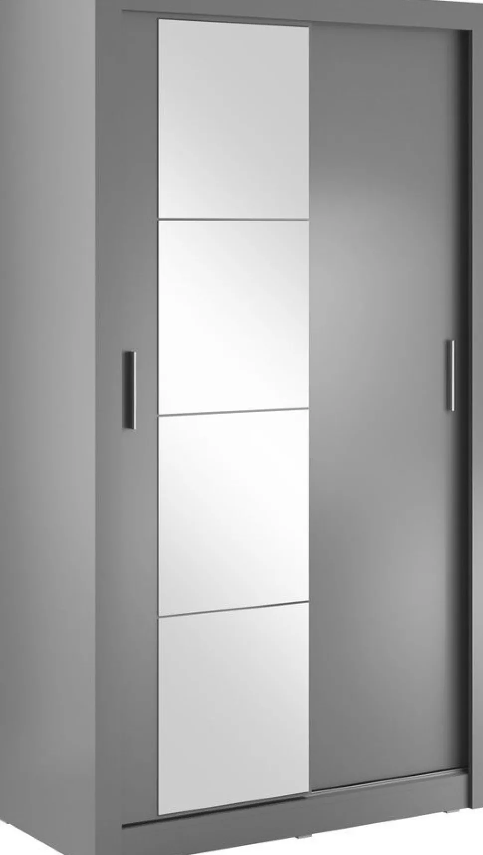 En snygg och mycket rymlig med en modern design. Tillverkad i Chipboard och med många förvaringsmöjligheter. Bakom de två skjutdörrarna, varav en med spegel, finner du massa med utrymme, klädstång och hyllplan. Handtag av plast med blank finish. Levereras omonterad.