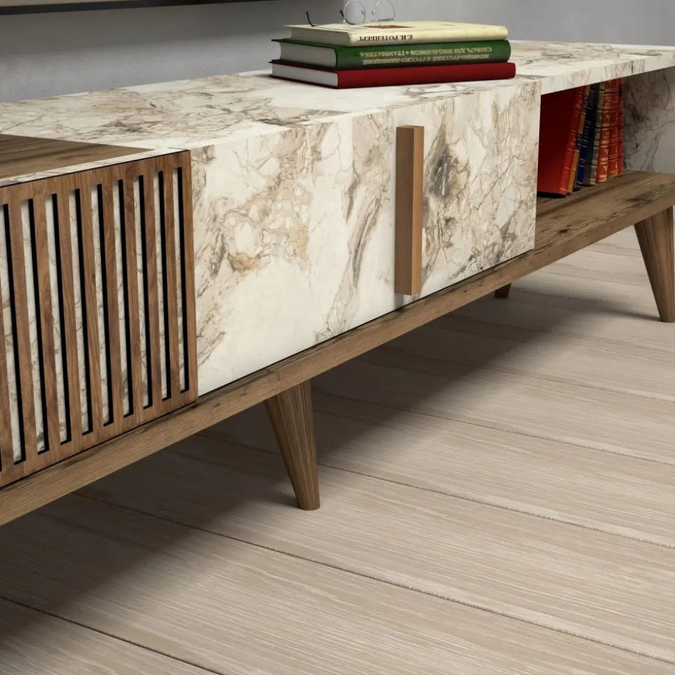 Mediabänk av melaminbelagd spånskiva och ben av plast.