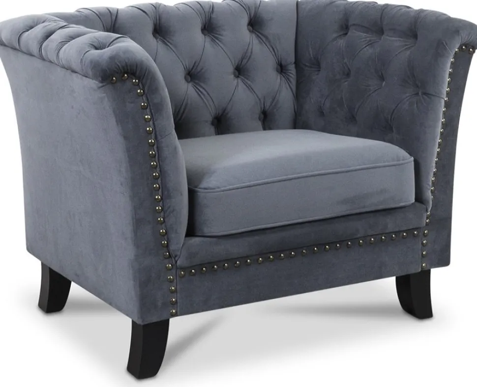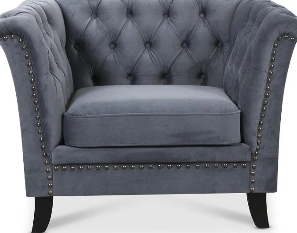 Milton soff- och fåtölj-serie har en klassisk chesterfield design med en slankare formgivning. En stilren artdeco i ett mjukt sammetsliknande tyg, paros 6. Svarta matchande ben.