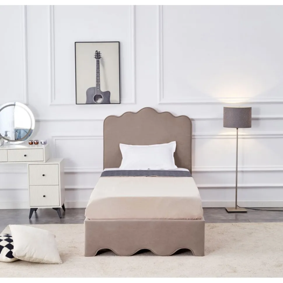 Sängram i mörkbeige sammetstyg. Madrass ingår ej. Sängram med runda och mjuka former för att ge ett lugnt intryck i sovrummet.