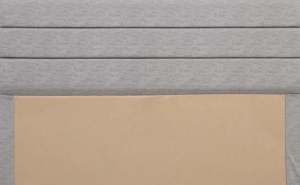 Sänggavel av trä med klädsel av tyg och stoppning av skum.