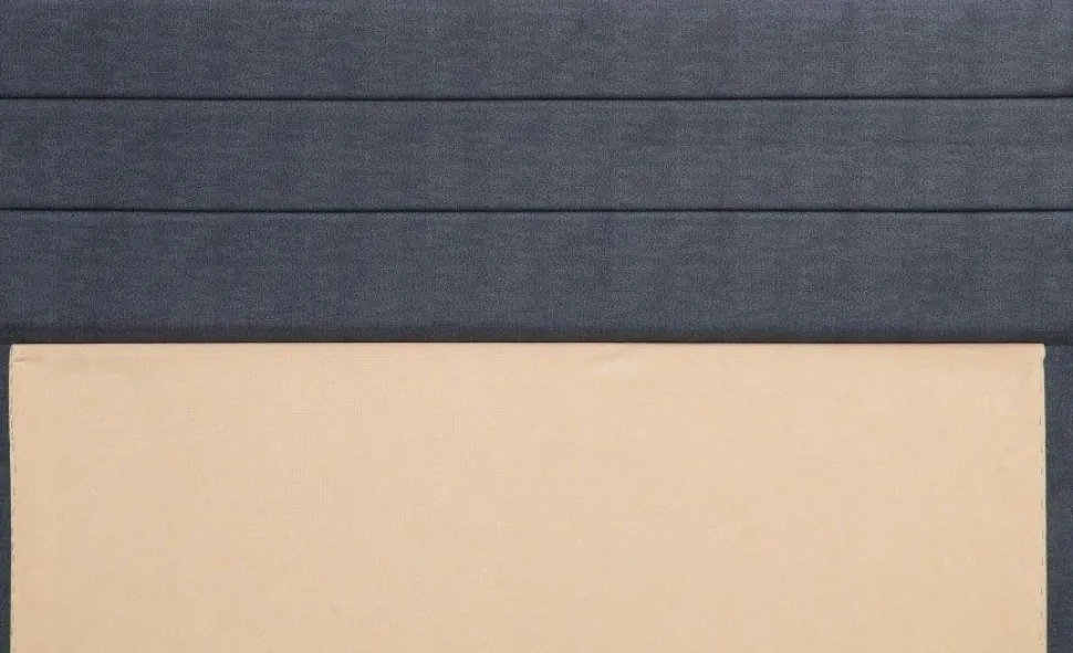 Sänggavel av trä med klädsel av tyg och stoppning av skum.