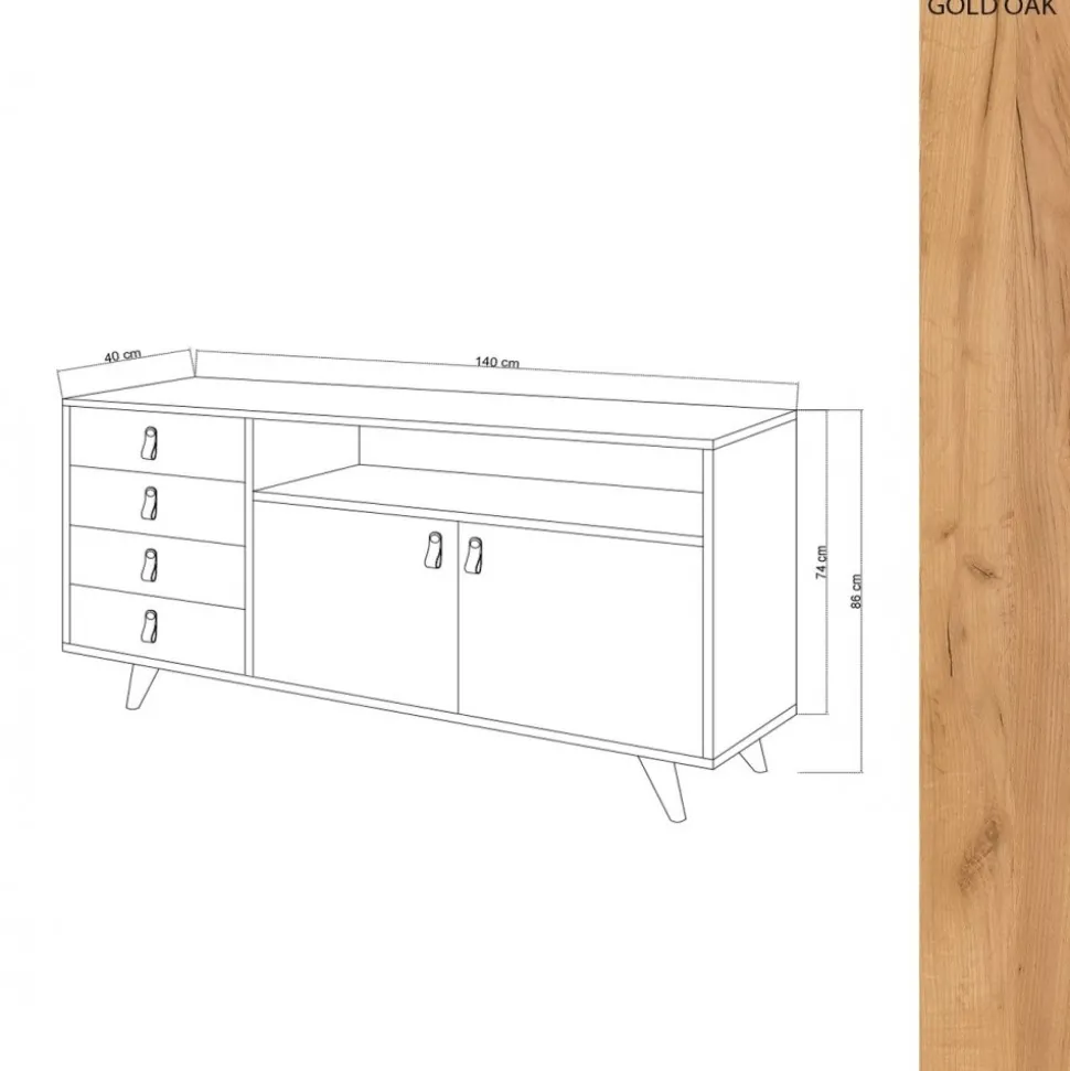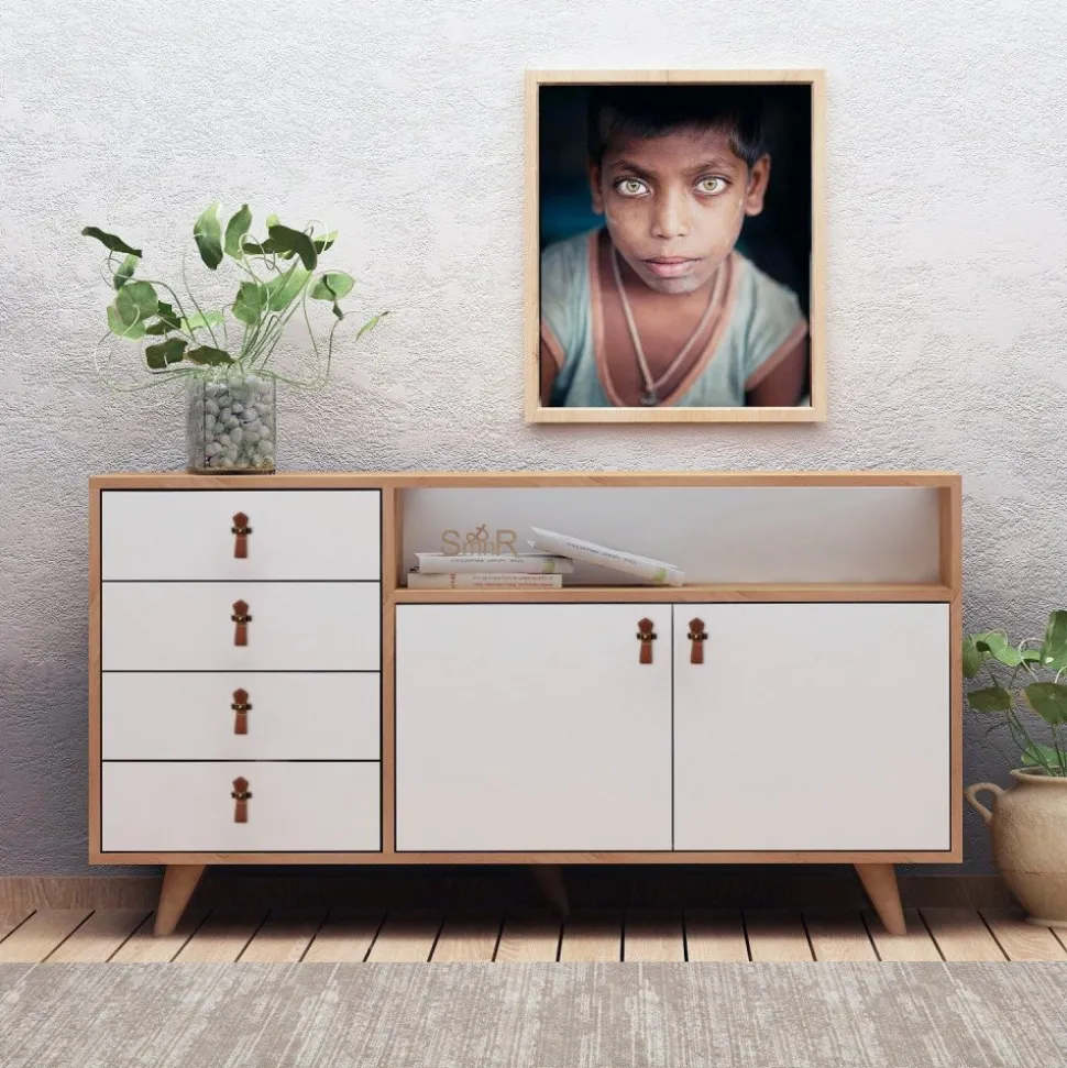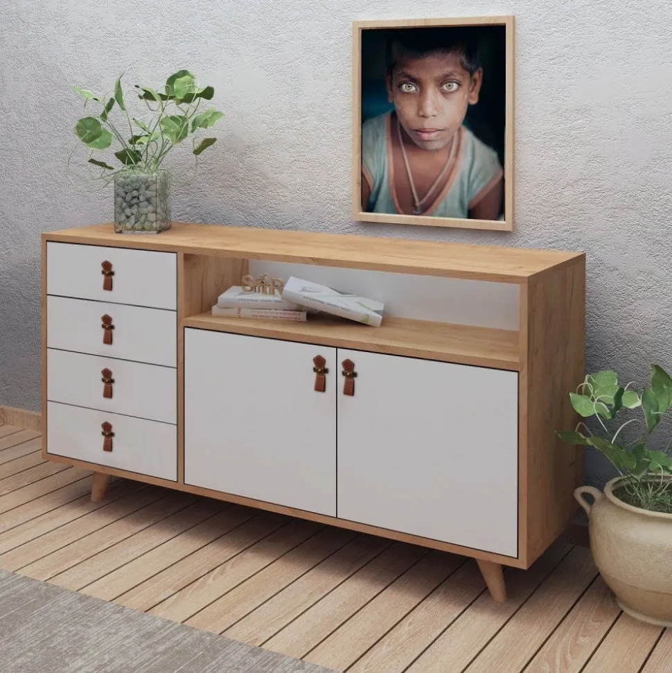 Skänk av trä med handtag av konstläder.