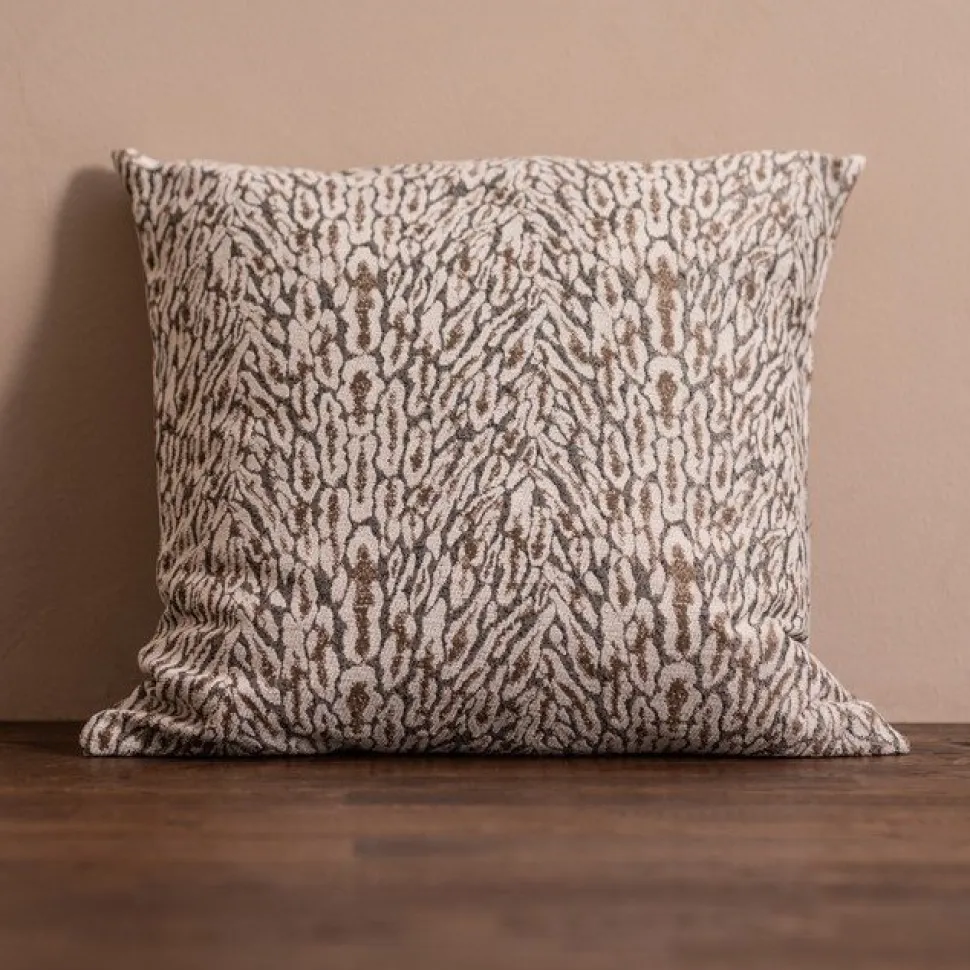 Prydnadskudde i djurmönster som påminner om savannen. Kudden går i ljusa gråa, beiga och vita toner. Fram och baksida har samma mönster och dragkedjan är gömd längs med sömmen.
