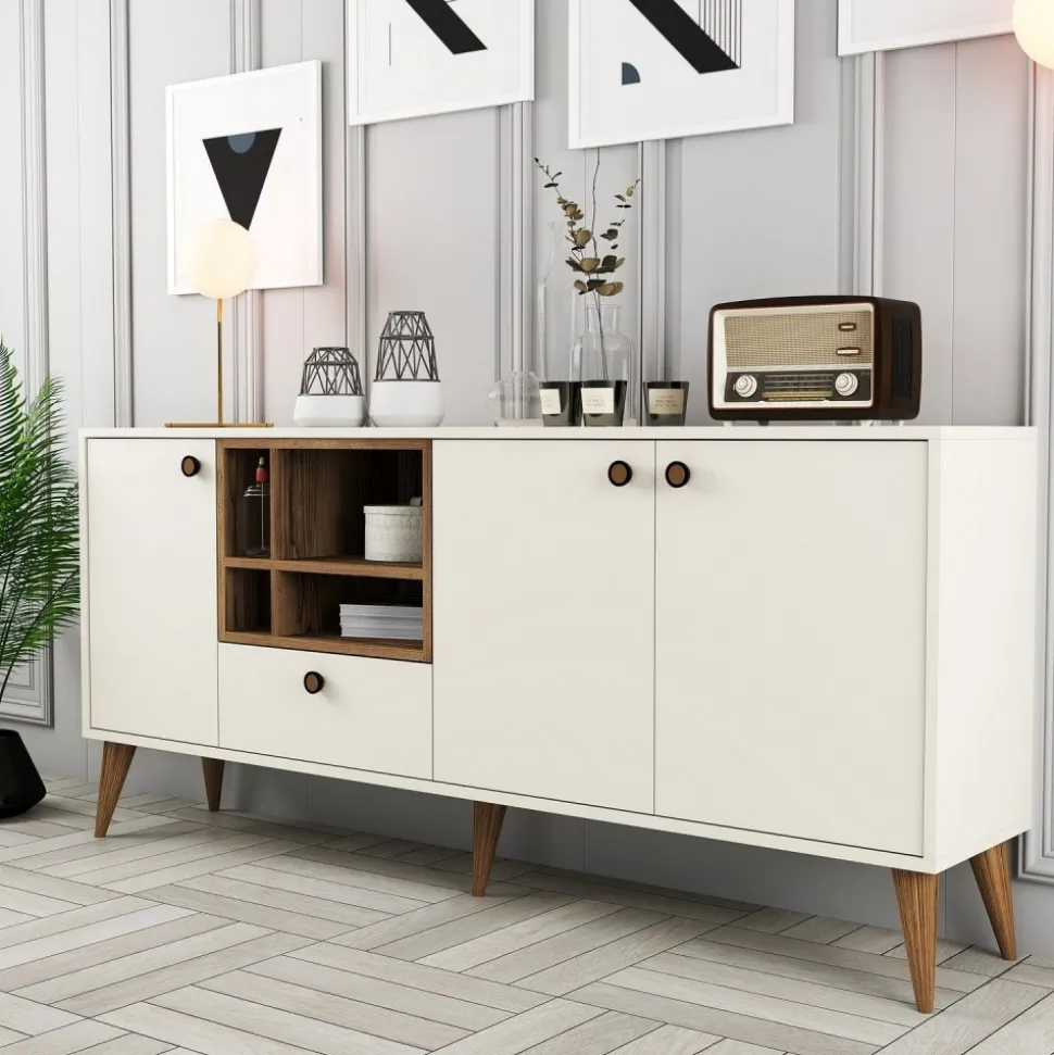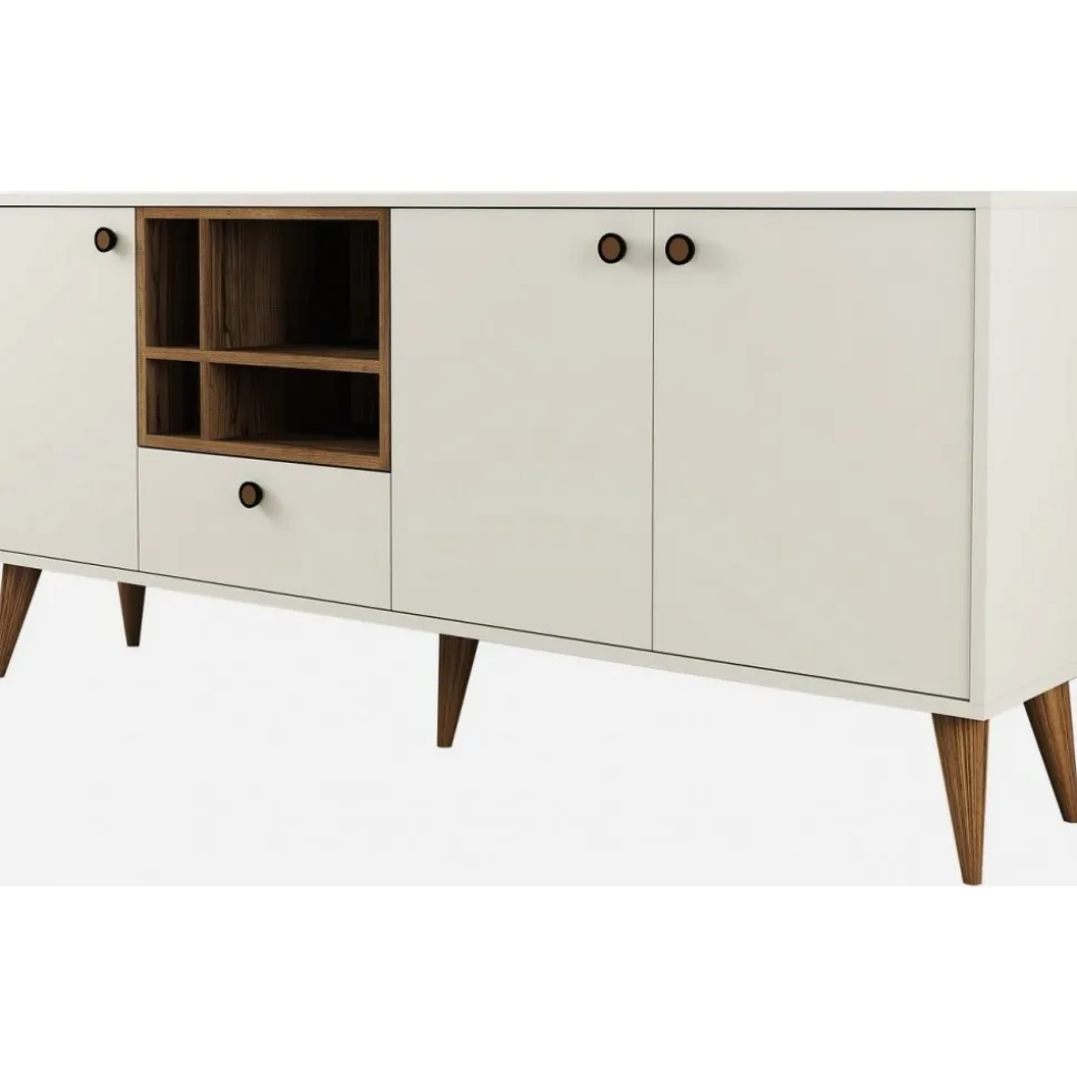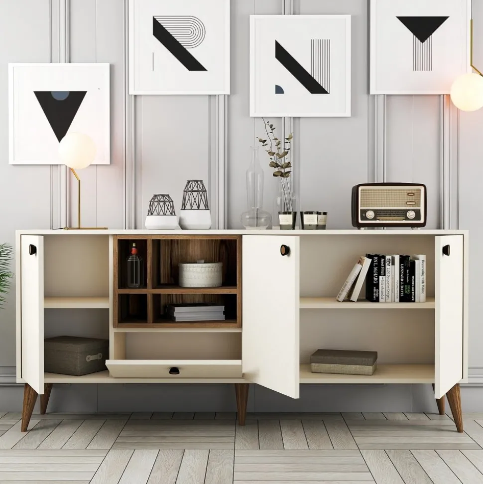 Skänk av trä med ben och handtag av plast.