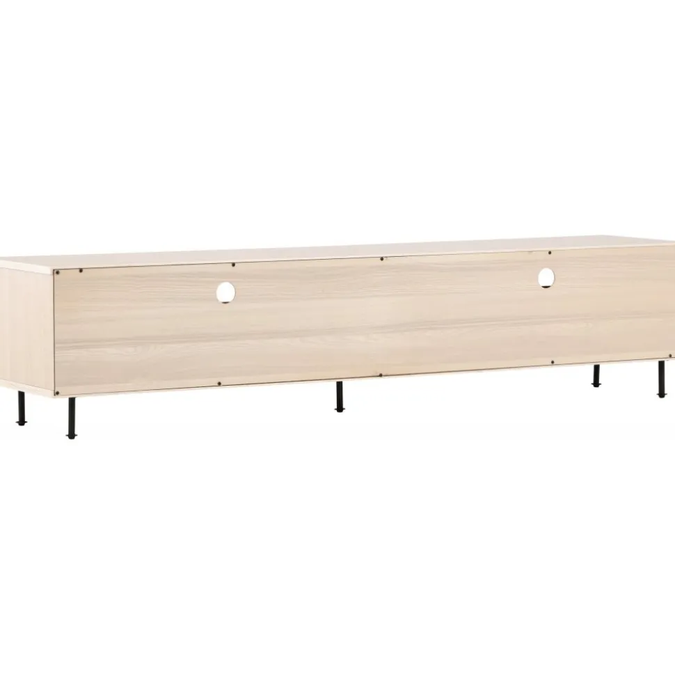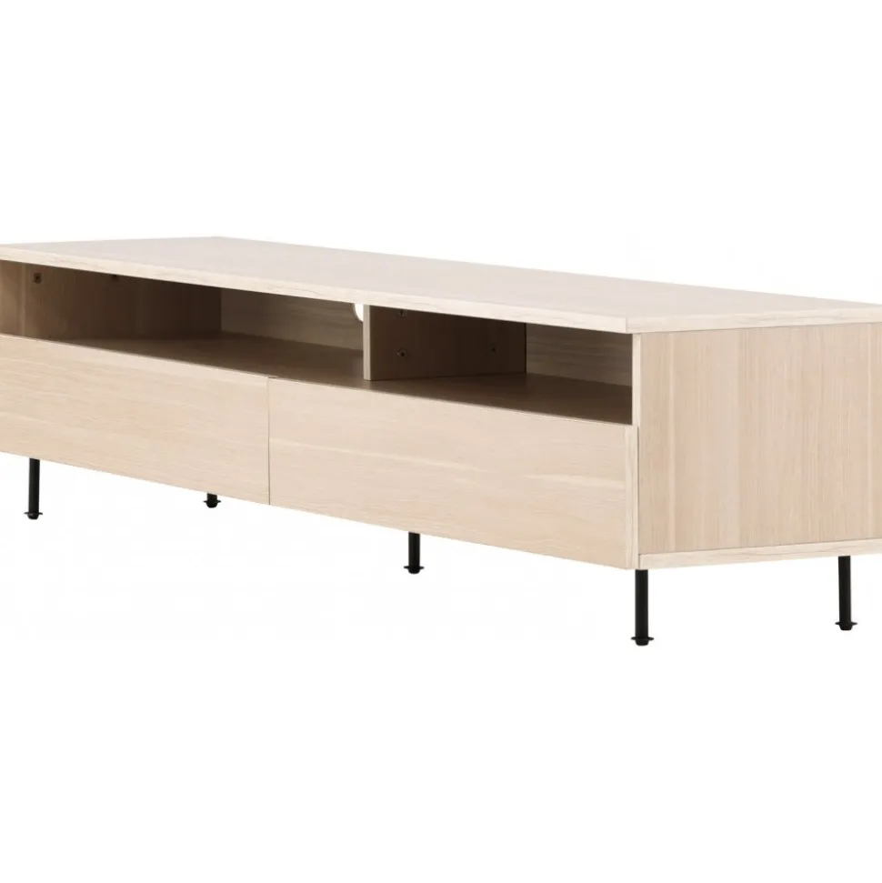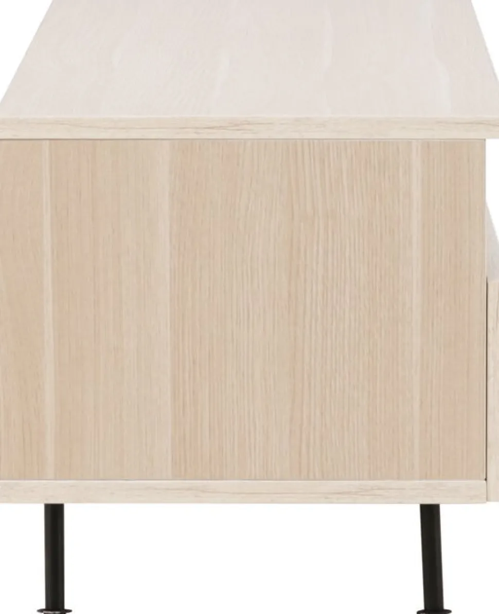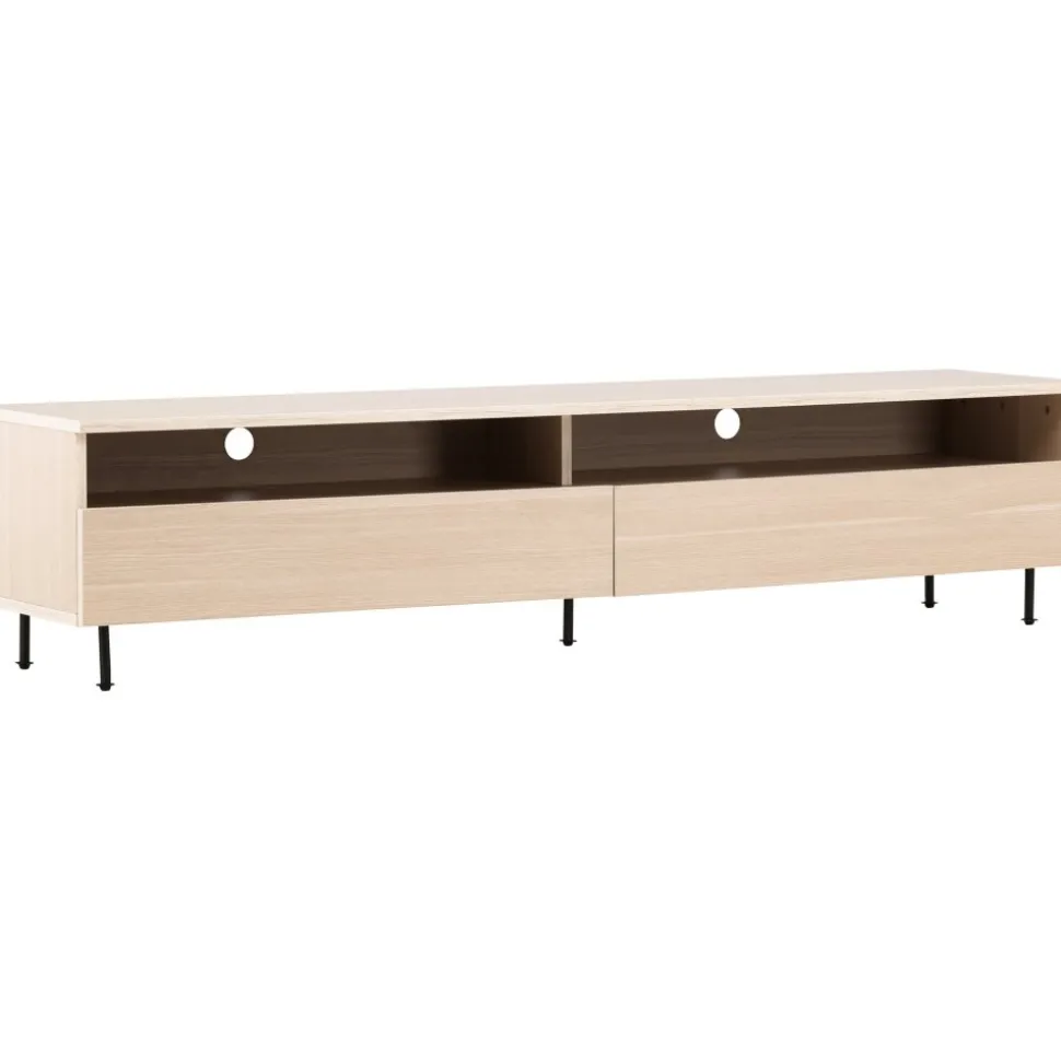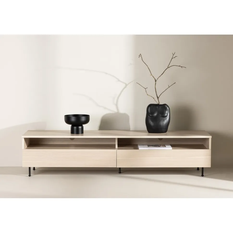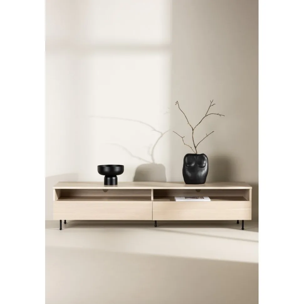 Möblera ditt vardagsrum i den nordiska stilen med vår lyxiga Tv-bänk i vitputsad kulör från serien Navarra! Denna underbara möbel med en hållbar yta av vitputsat melamin imponerar verkligen med sin moderna stil och smarta förvaringslösningar. Navarra har två rymliga lådor, perfekta för att diskret röja undan allt från fjärrkontroller till favoritböckerna. De öppna hyllfacken ovanför ger dig flexibilitet att visa upp något vackert föremål eller låta de mest använda prylarna vara nära till hands. Skapa sedan även din egen harmoni genom att pryda toppskivan med fina ljusstakar och snygga högtalare för en fulländad tv-upplevelse.Den här Tv-bänken lutar mot fyra smala ben i svart färg som lyfter upp den till en stilren nivå. Men tv-bänkens höjd ger inte bara ett lyft till din inredning utan underlättar också din städrutin – här kommer dammsugaren smidigt under och håller rent i ditt hem. Här får du verkligen en Tv-bänk som kombinerar tidlös design med smart förvaring. Upplev en känsla av lugn och organiserad lyx varje dag och bygg din soffhörna tillsammans med Navarra för en komplett Tv-hörna! Levereras omonterad.