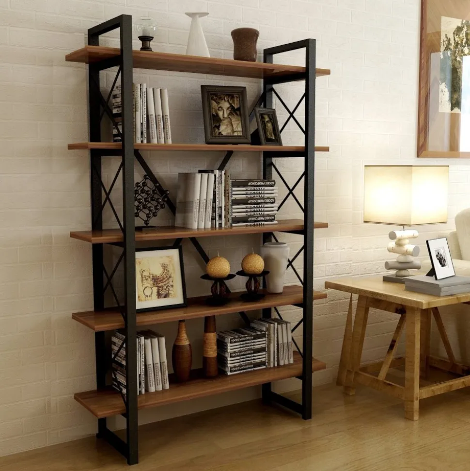 Bokhylla av pulverlackerad metall med hyllplan av melaminbelagd spånskiva.