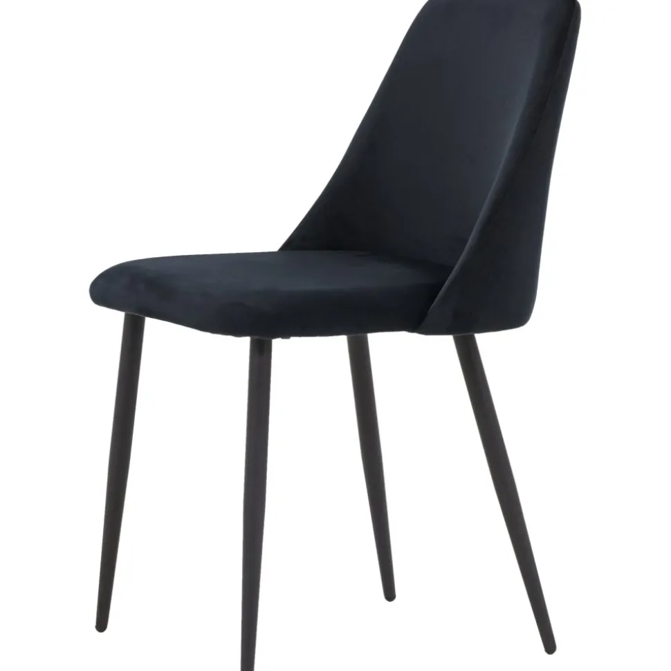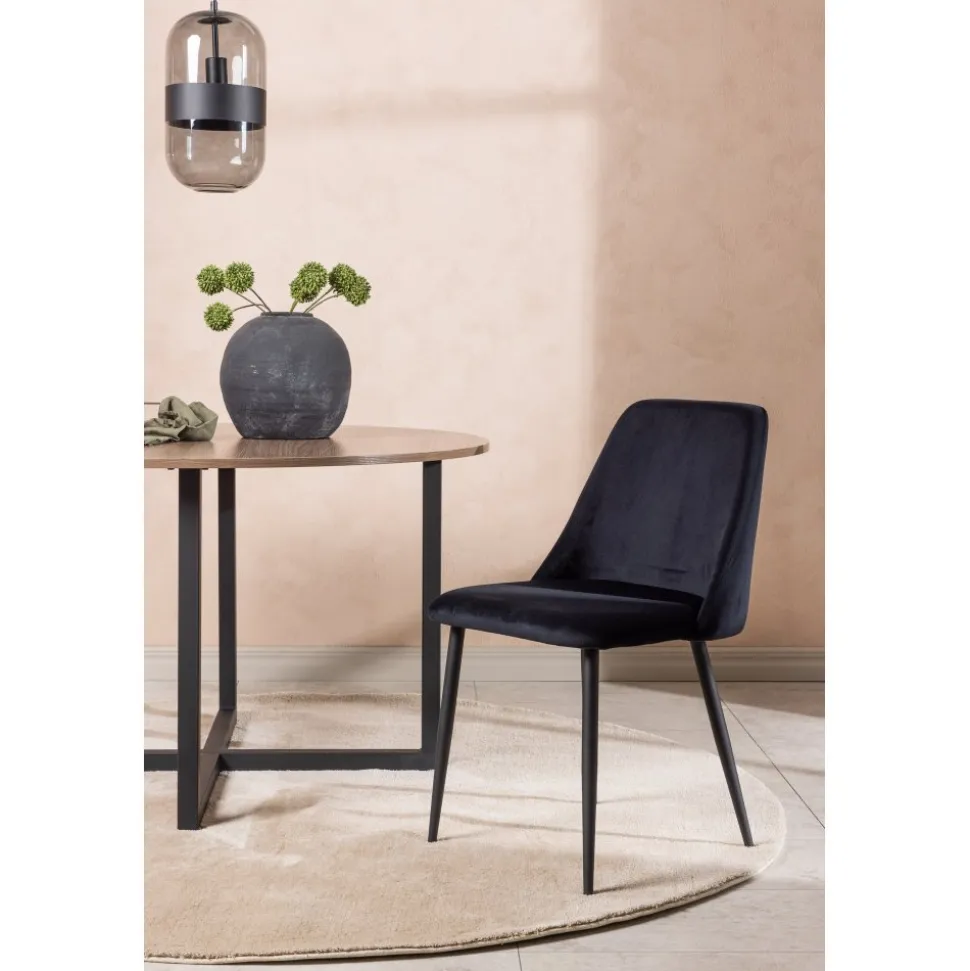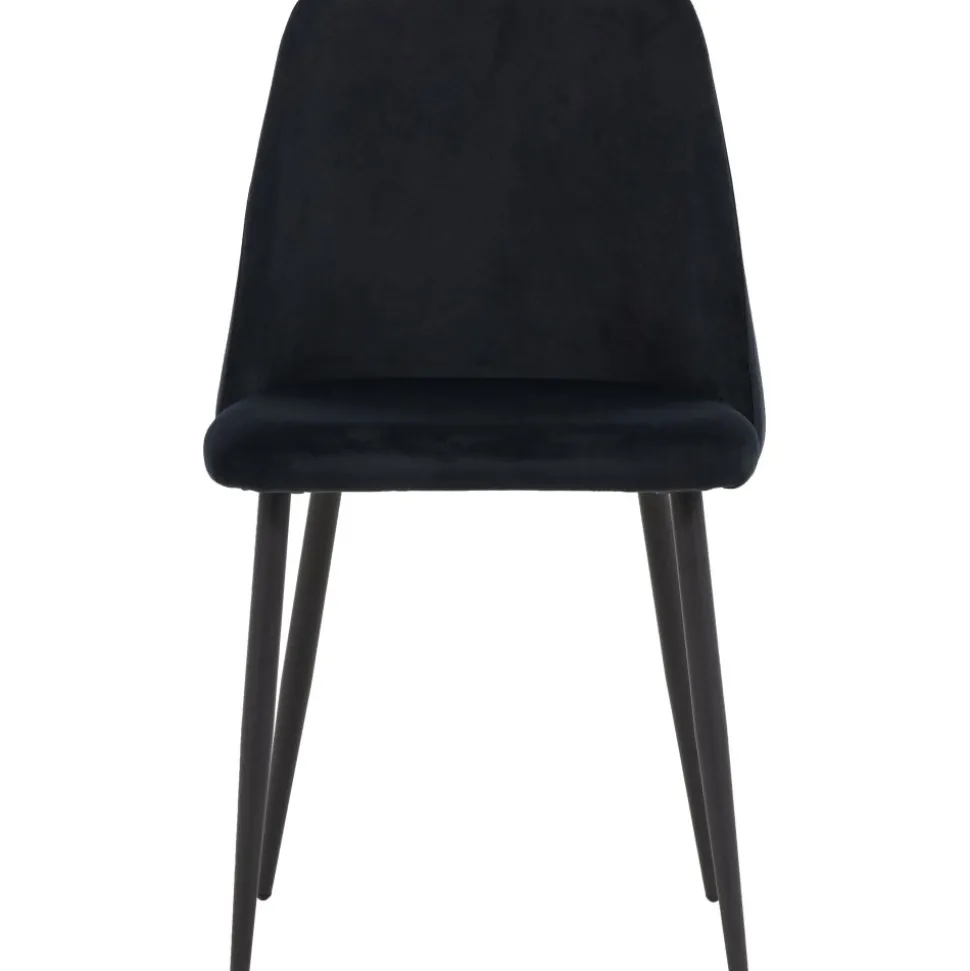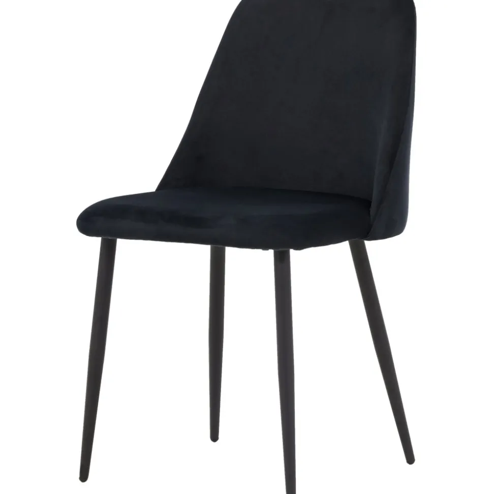 Matstol med helklädd sits i svart sammetstyg och stolsben i matchande svart kulör. Här får du en som skapar ett lyxigt skimmer till rummet och bidrar till en inbjudande och modemedveten atmosfär. Det ska kännas skönt att slå sig ner för en smarrig måltid!